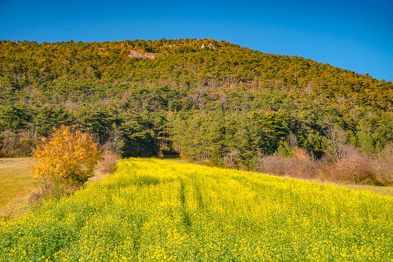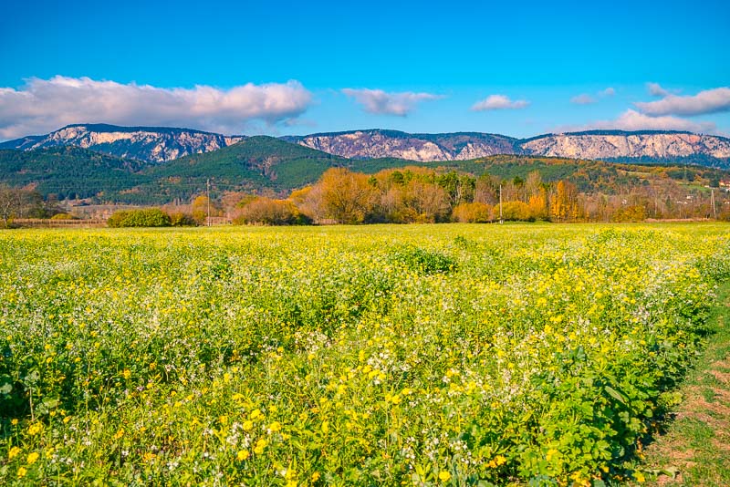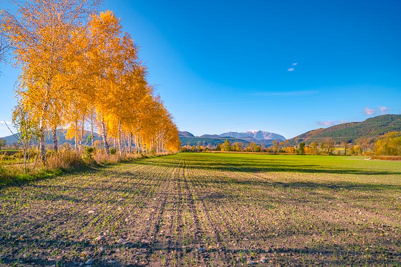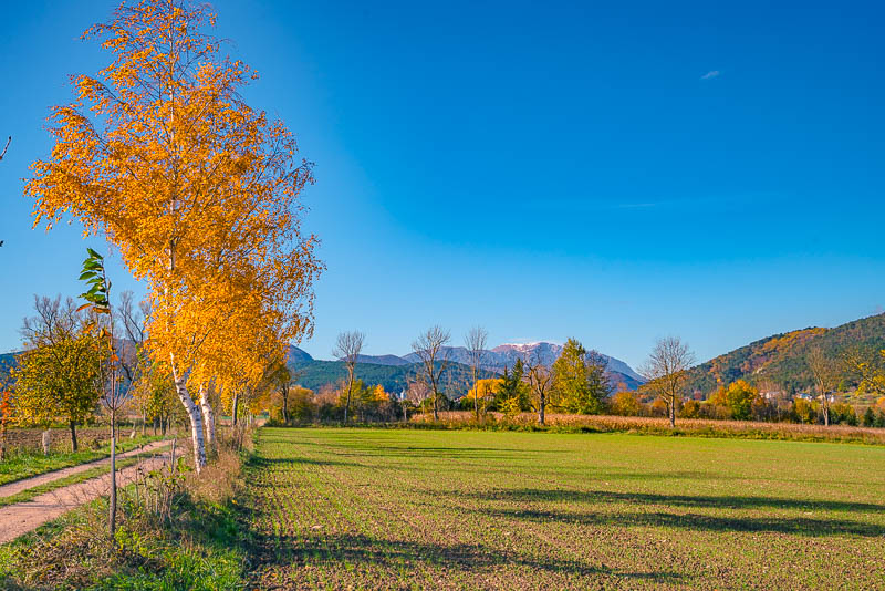 ... and down to the fields towards the plane. The two umbrella pines are marking the last foothills of the mountains, built from conglomerate.