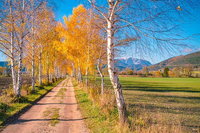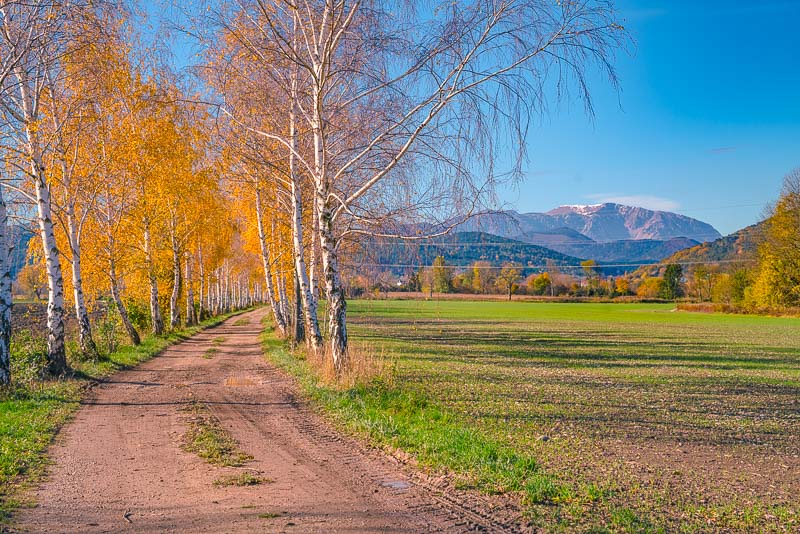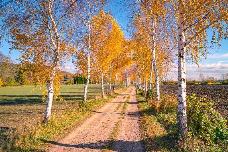 The birch alley leads through the fields heading for Willendorf.