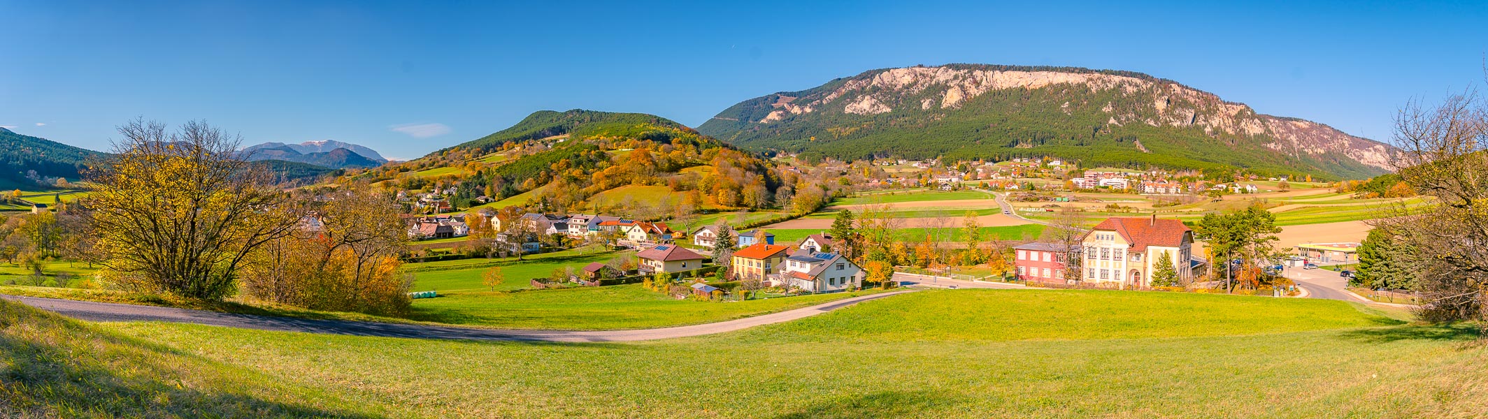 Panoramablick von der Höfleiner Wallfahrtskirche zum Schneeberg und zur Hohen Wand.