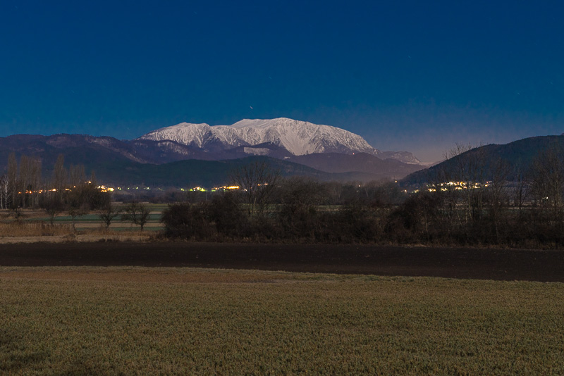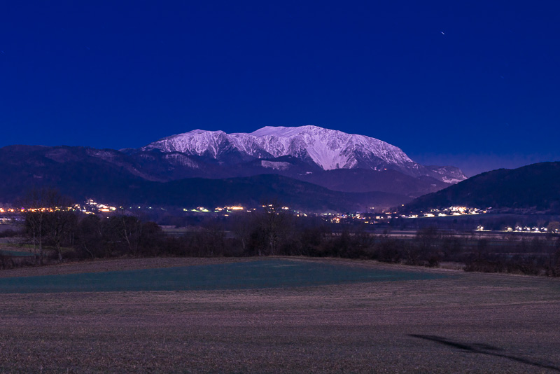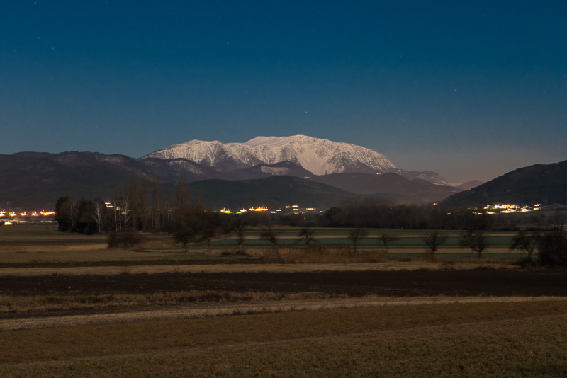 A clear starry night, new snow on Schneeberg and full moon yesterday. Dressed in multiple layers, equipped with torch light, camera and tripod, I drive to the fields near Saubersdorf.