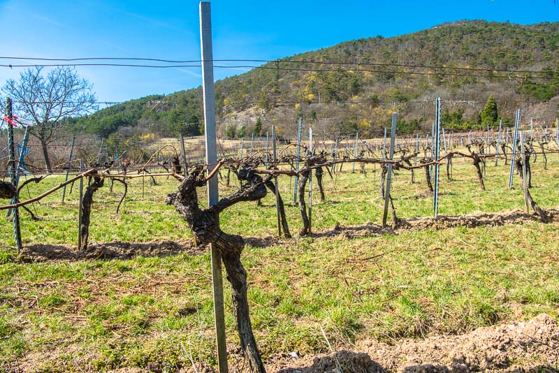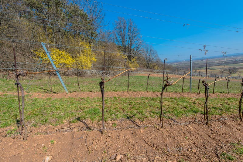 Start des Jahres im Weingarten: die Reben sind geschnitten und die Stummel wurden waagrecht fixiert - würden die Triebe senkrecht bleiben, geht aller Saft in die Spitze, und die anderen Triebe werden schwach.