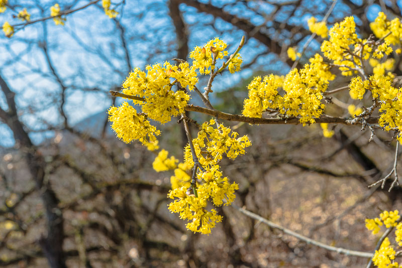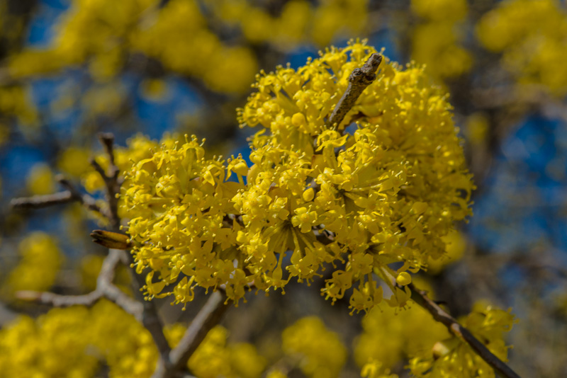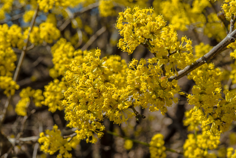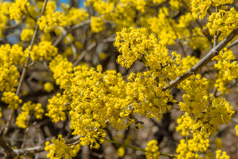 Dirndlsträucher (Cornus mas) in voller Blüte.