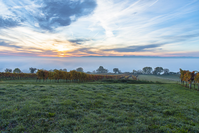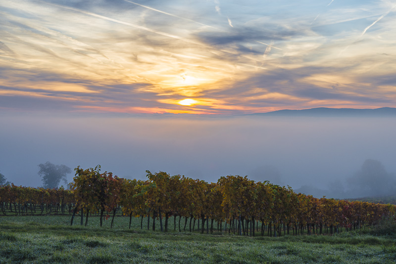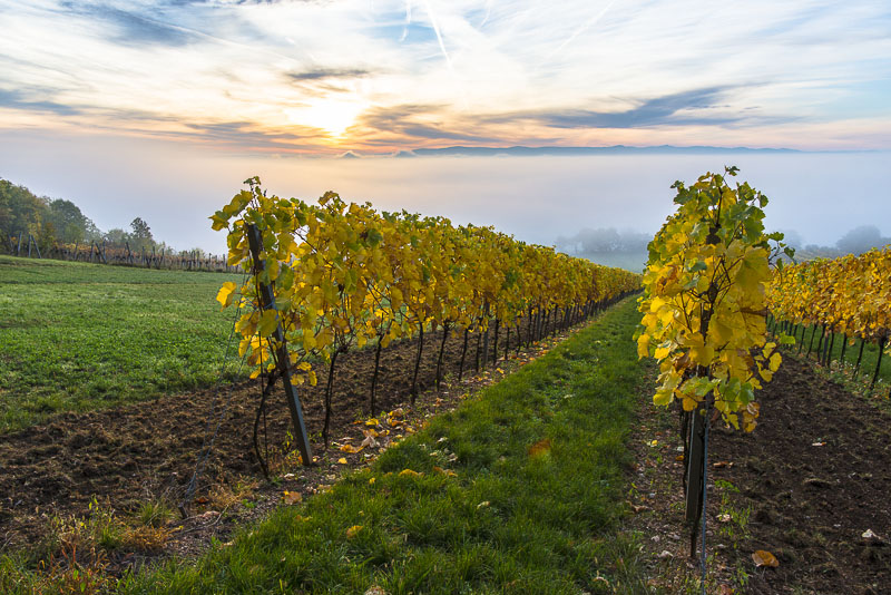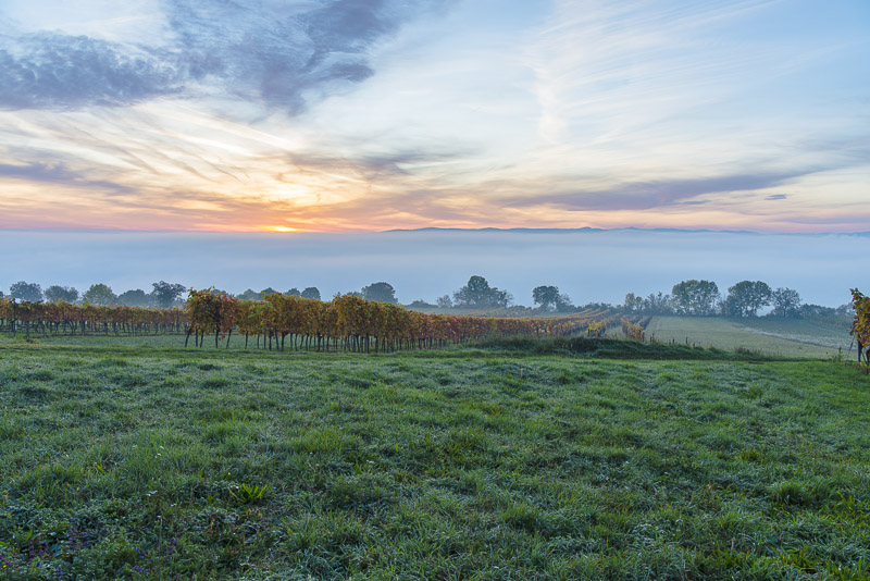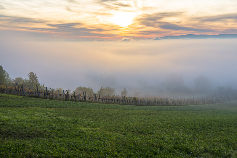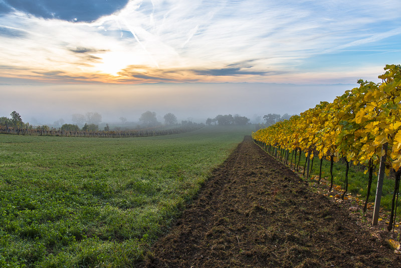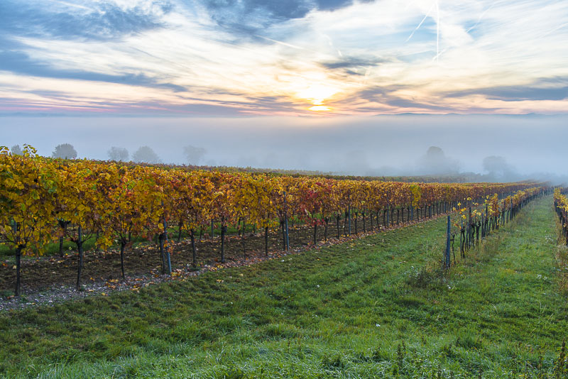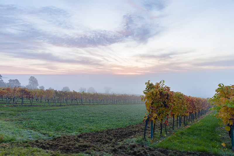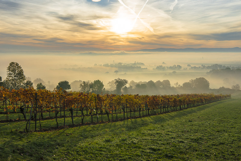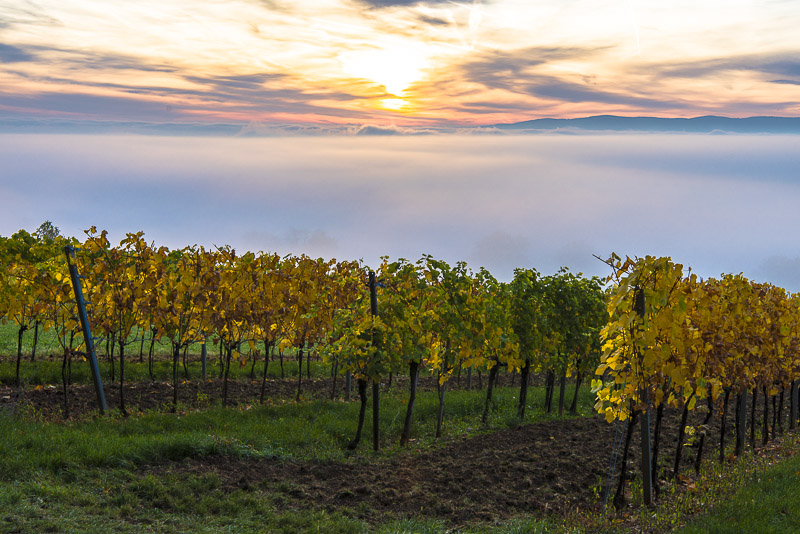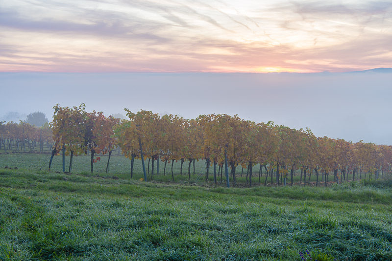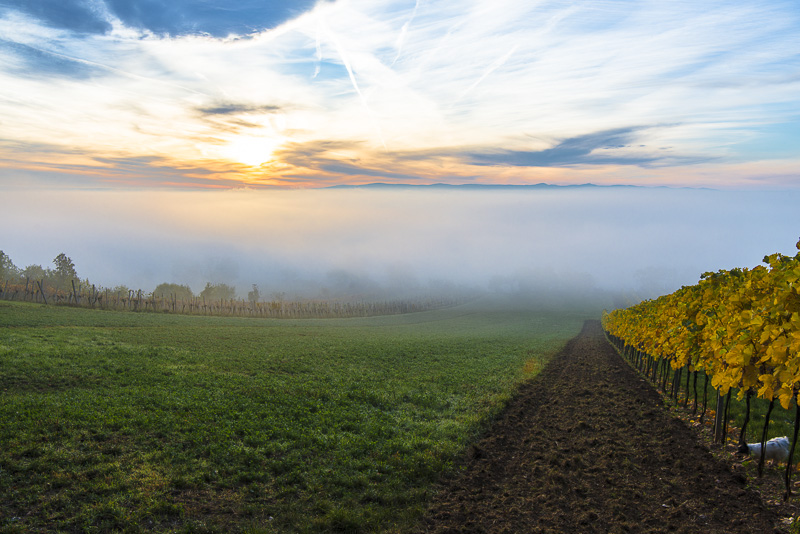 Nebeltage beginnen, und gestern schon zog am Vormittag Nebel hin und her. Ich bin daher kurz nach 7 Uhr und noch vor Sonnenaufgang im Weingarten.
