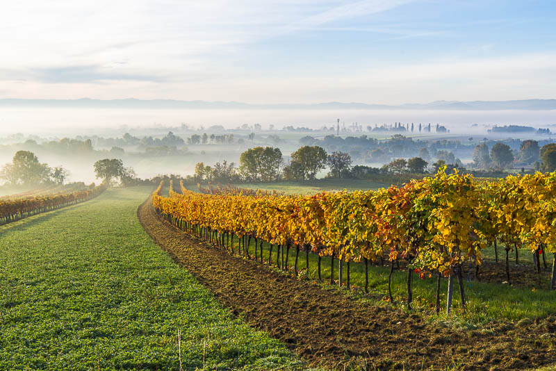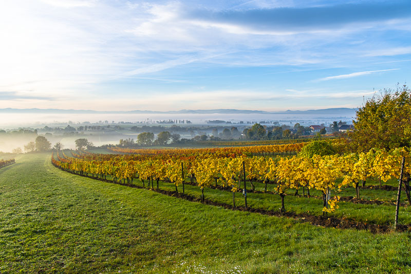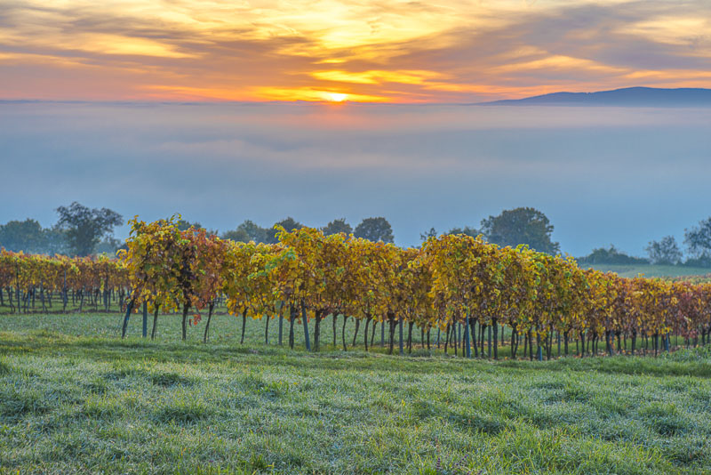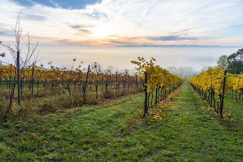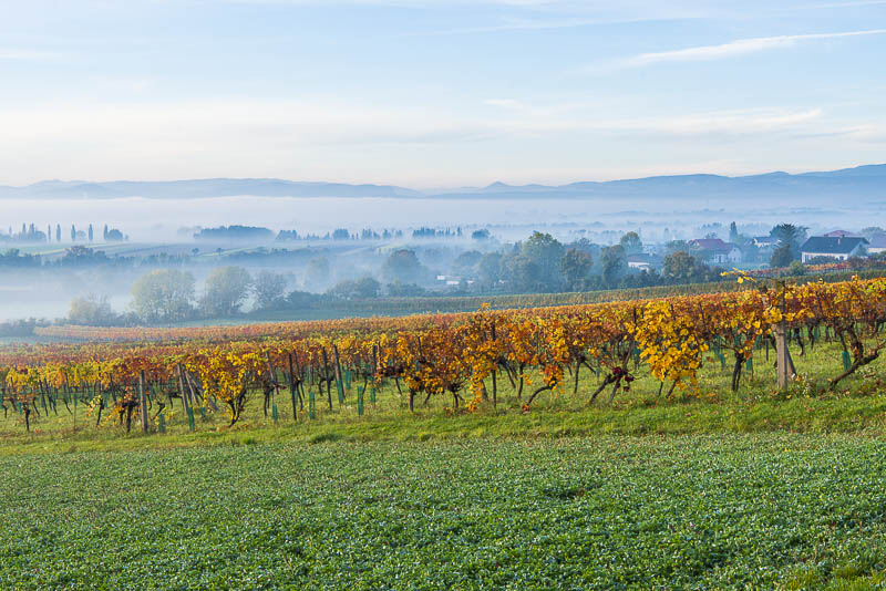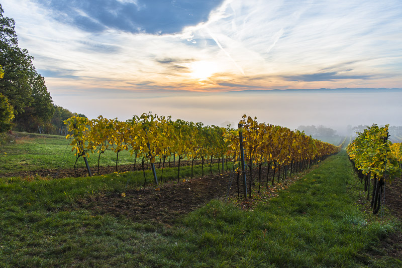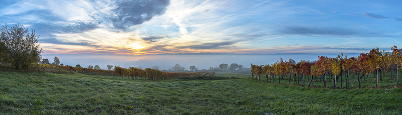 Panoramabild der Weingärten bei Winzendorf, mit Blick über den Nebel zum Rosaliengebirge. Hierher oder ins Bild klicken für eine größere Darstellung.