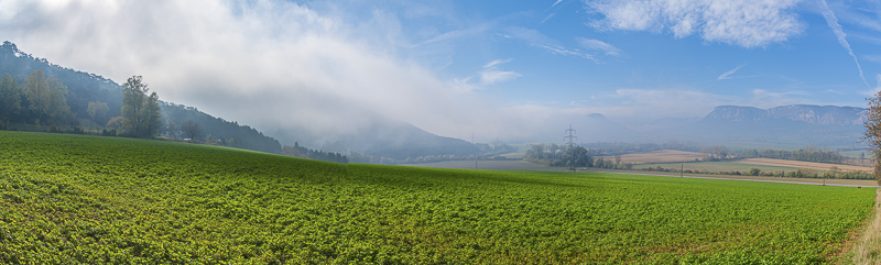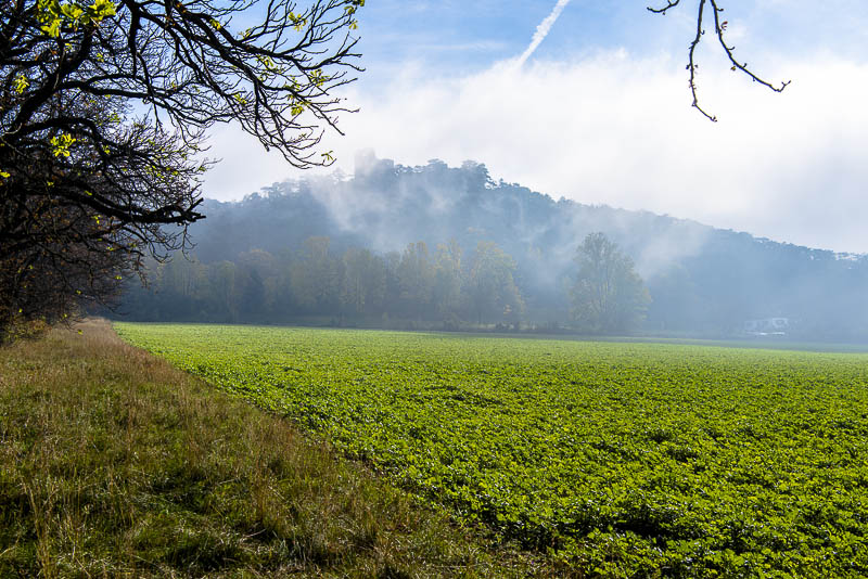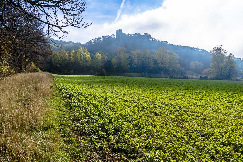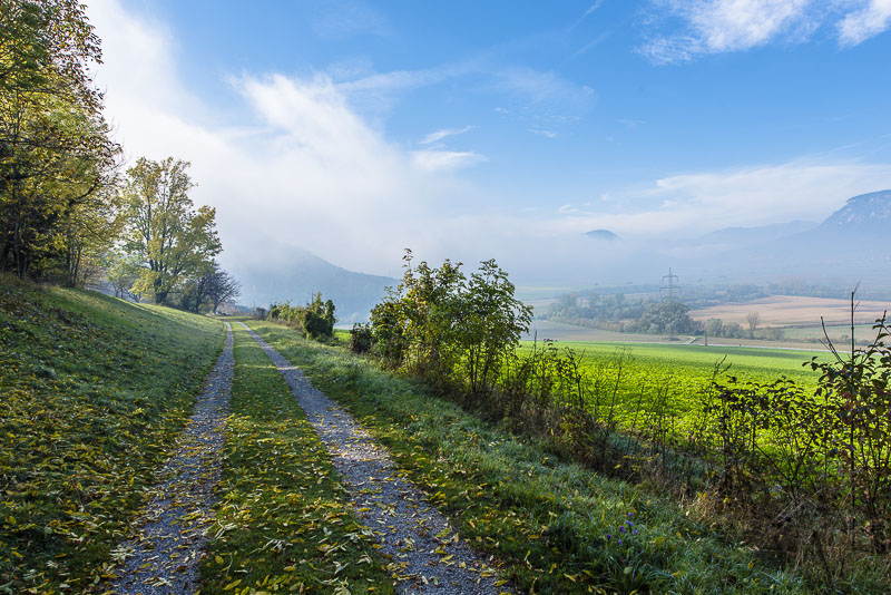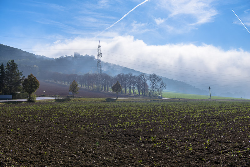 Ich muss zum Automechaniker, weil er eine Abblendlichtlampe tauschen muss. Da das ein klein wenig dauert, gehe ich einstweilen ein paar Meter spazieren. Blick zur Ruine Emmerberg, dahinter die Prossetschlucht, aus der der Nebel hervorquillt.