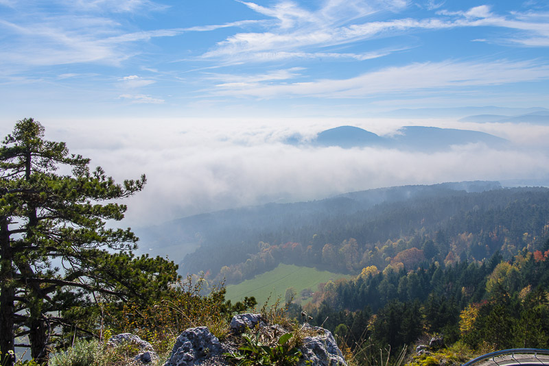 Hohe Wand rechts, Schneeberg und Kienberg teilweise vom Nebel verdeckt.