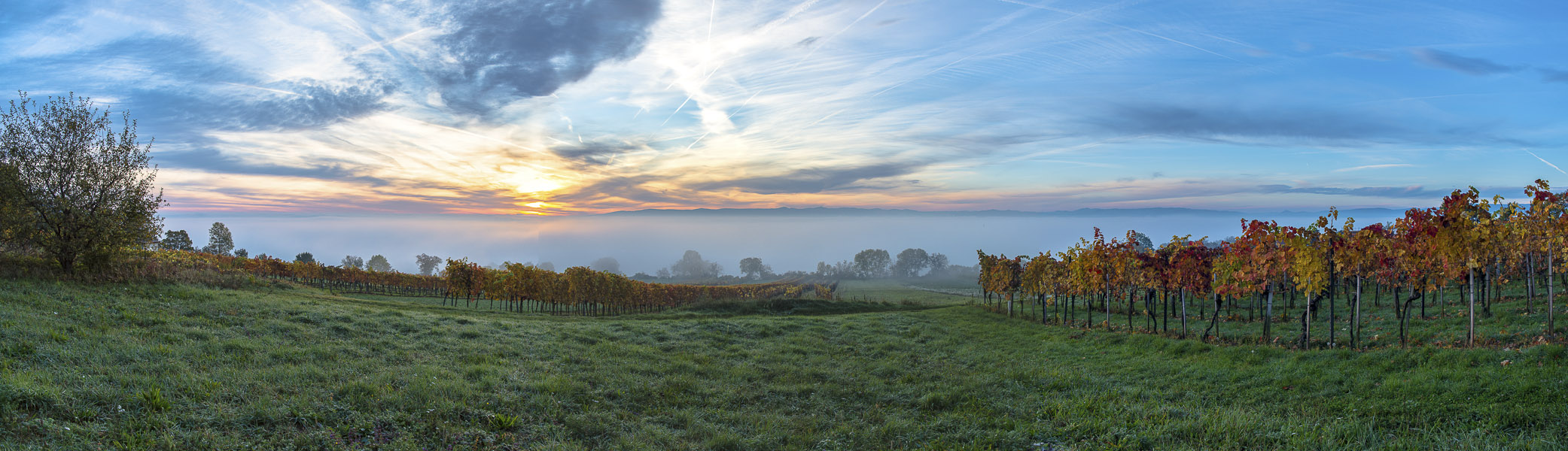 Panoramabild der Weingärten bei Winzendorf, mit Blick über den Nebel zum Rosaliengebirge.