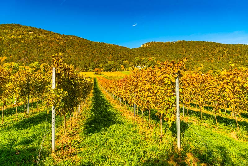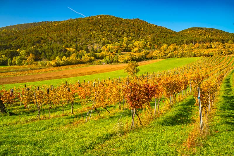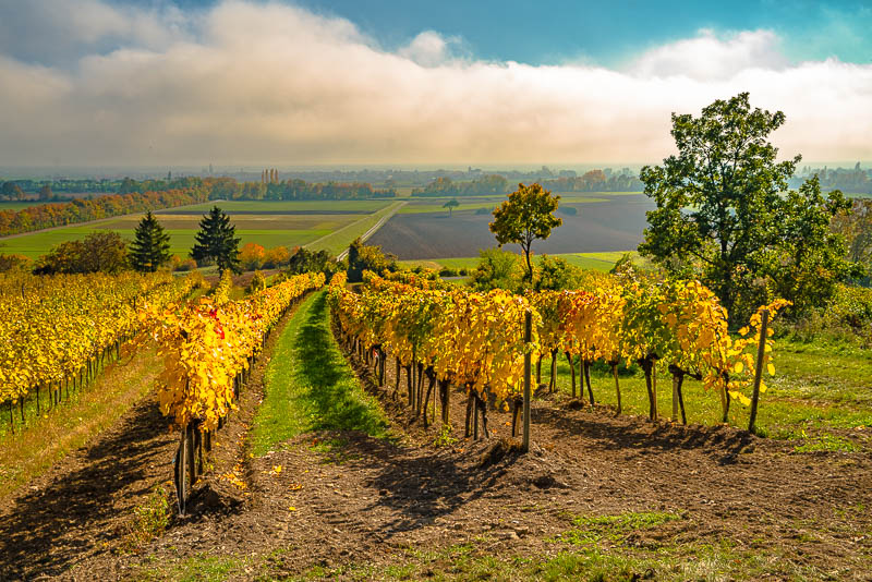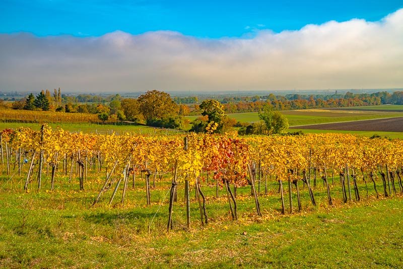 Weingartenpanorama nahe beim Ortsrand von Winzendorf. Hierher oder ins Bild klicken für eine größere Darstellung.