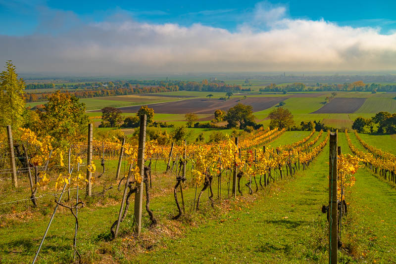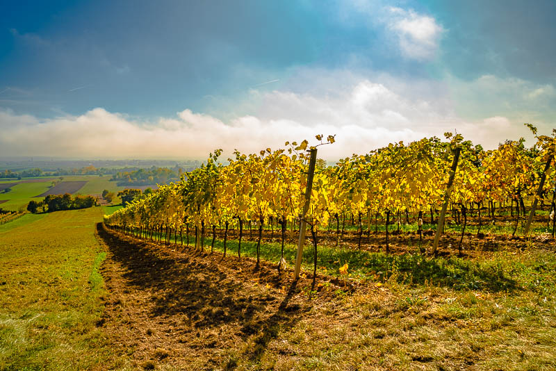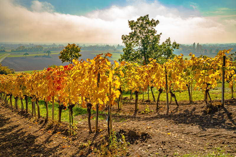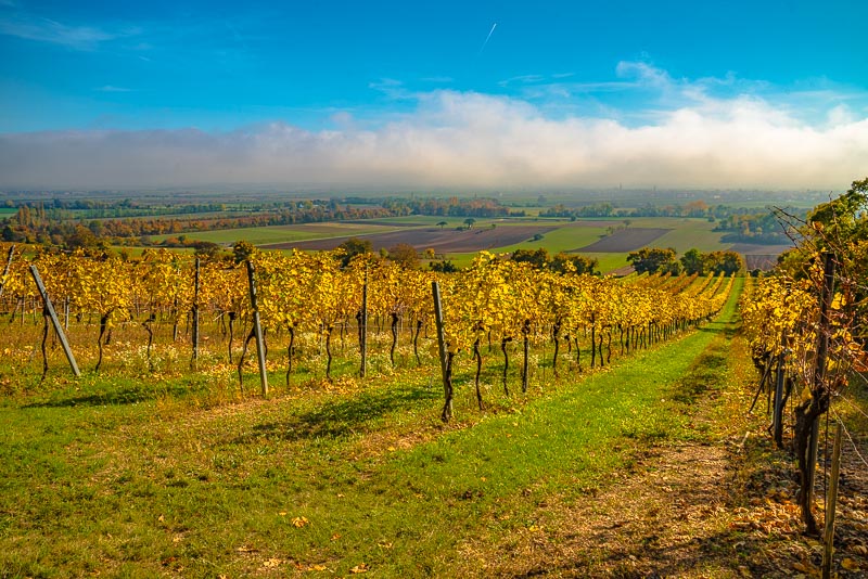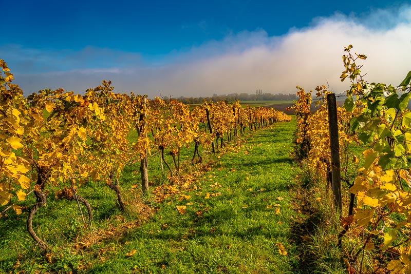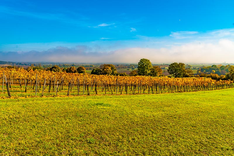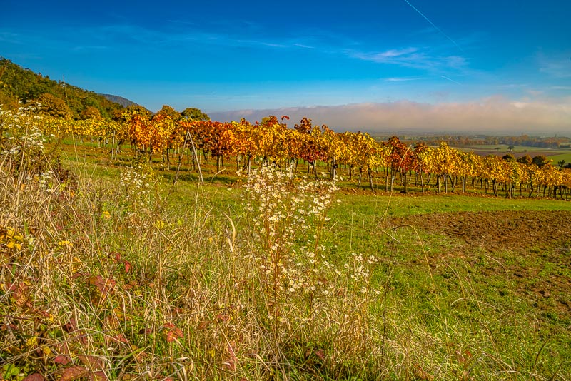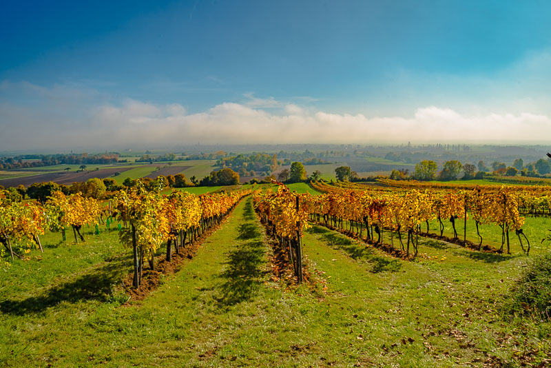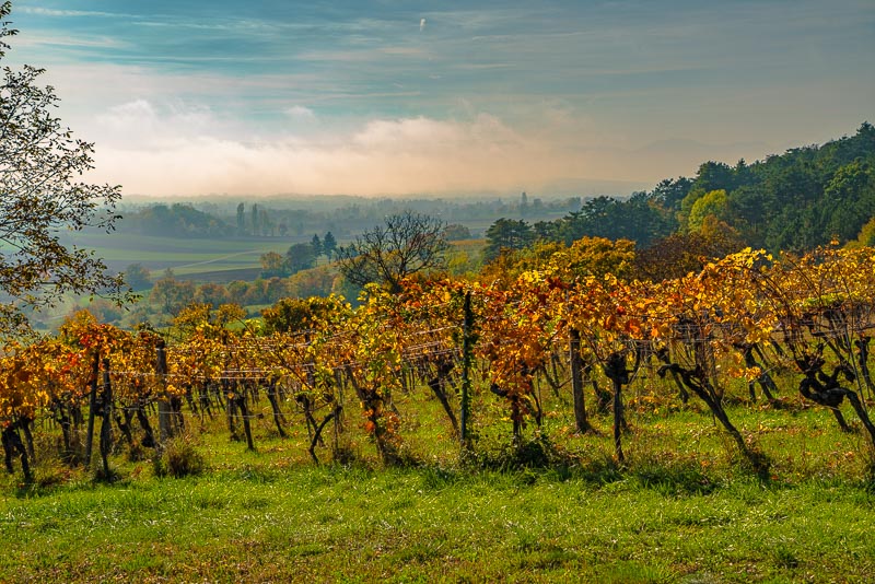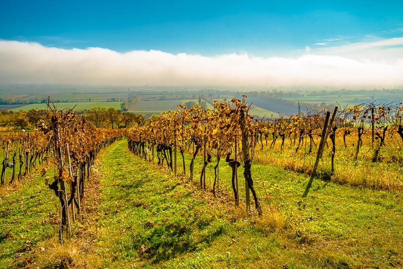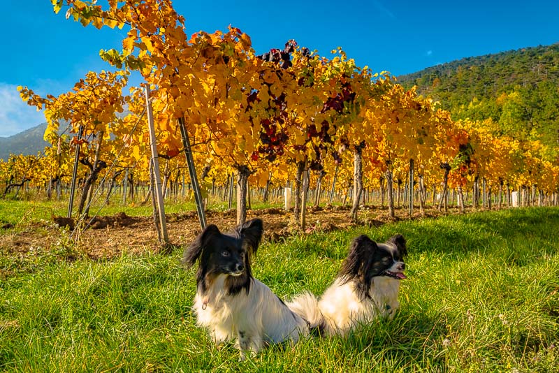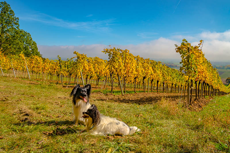 Heute früh ist es neblig. Gegen Mittag lichtet sich aber der Nebel und die Sonne kommt heraus. Ich beschließe, mit Lucy und Bella durch die Weingärten zu wandern.