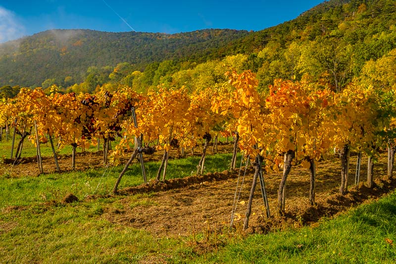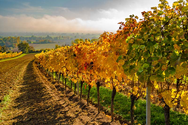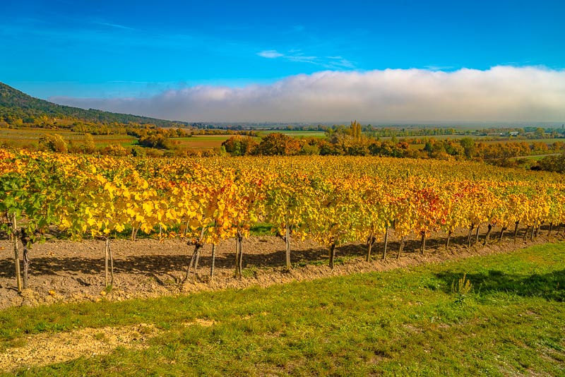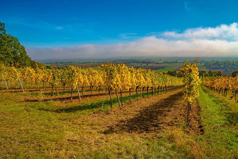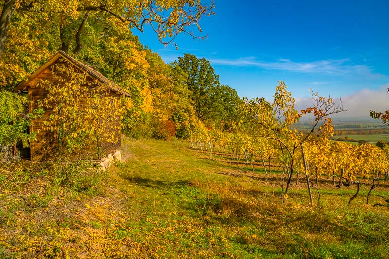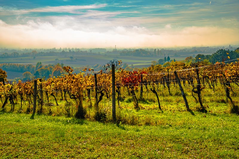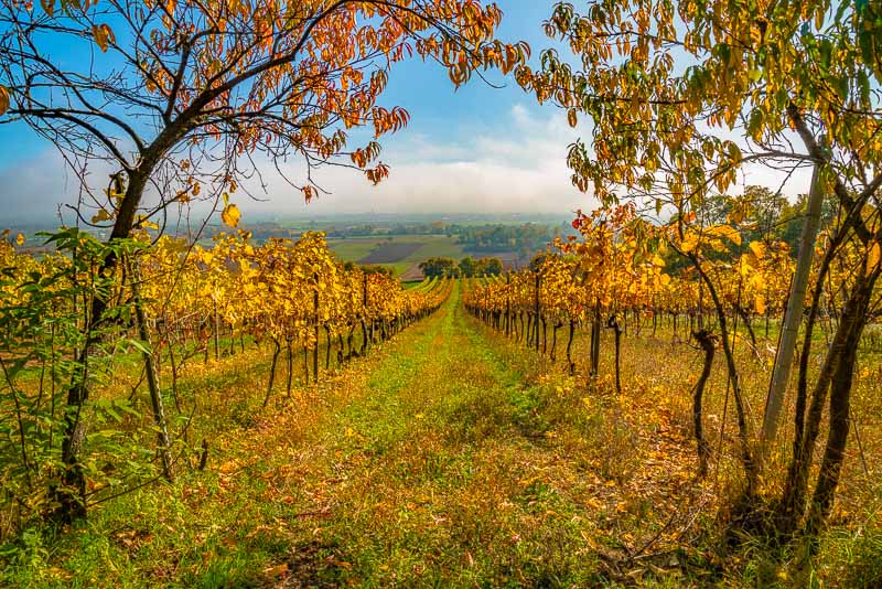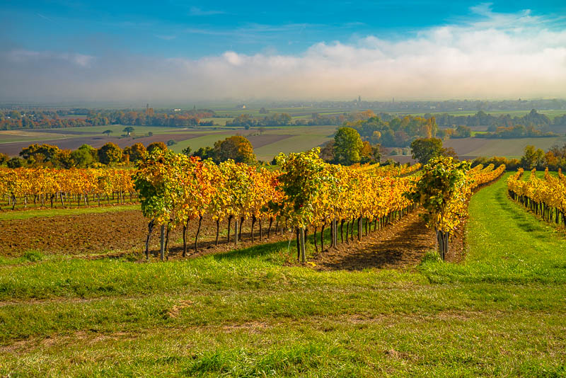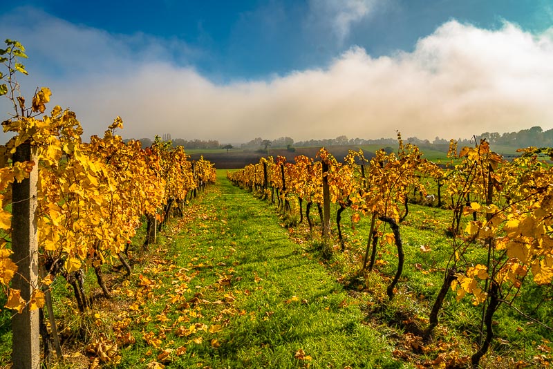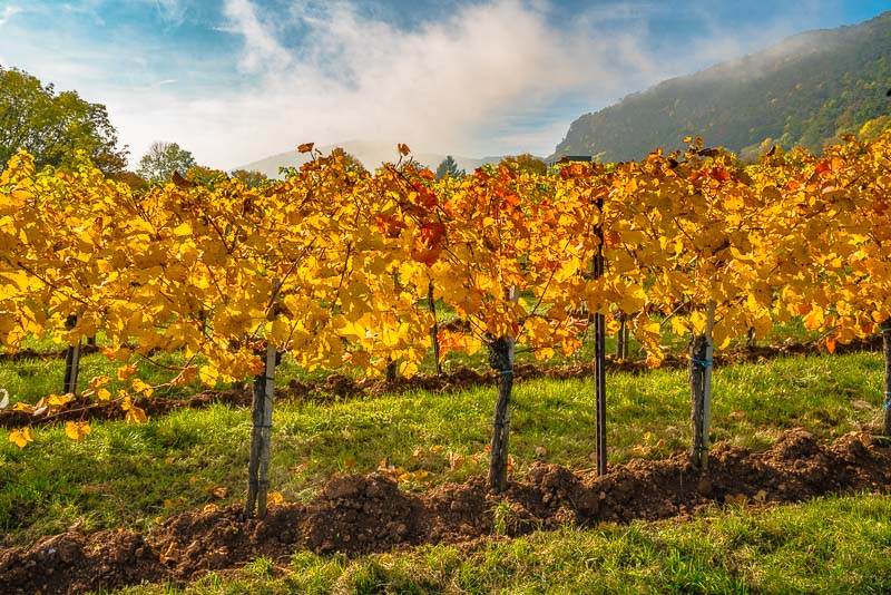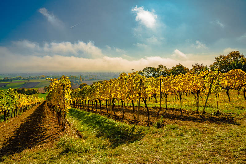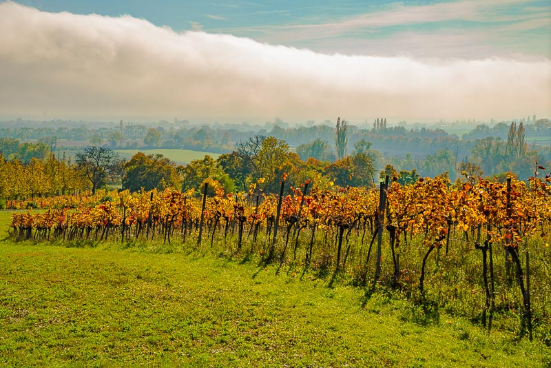 Heute früh ist es neblig. Gegen Mittag lichtet sich aber der Nebel und die Sonne kommt heraus. Ich beschließe, mit Lucy und Bella durch die Weingärten zu wandern.