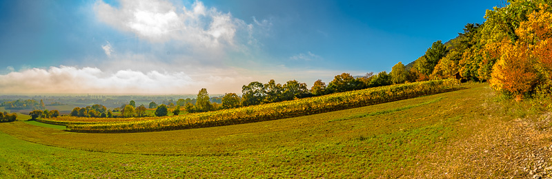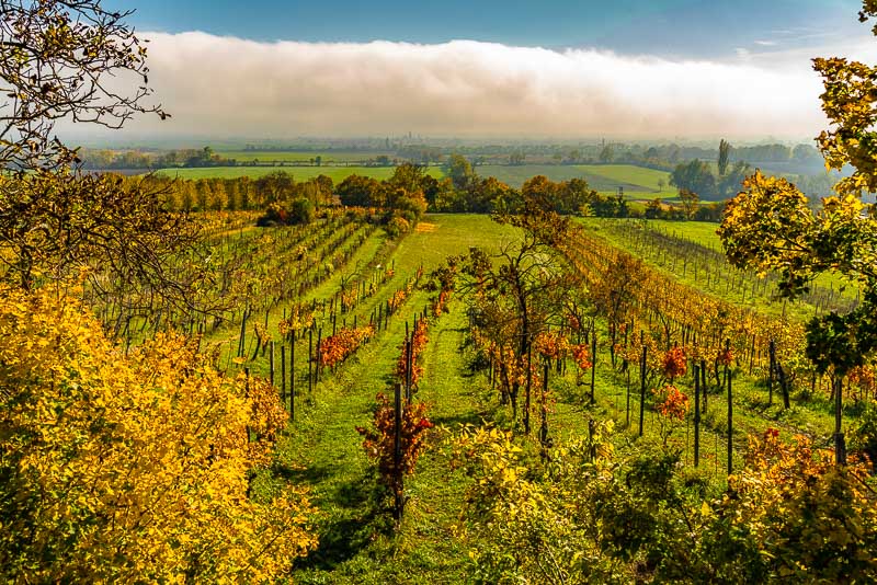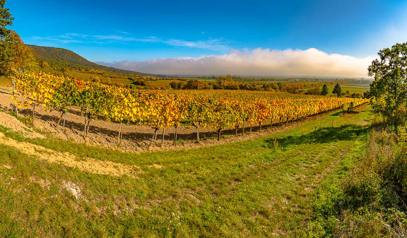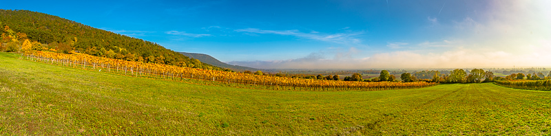 Weingartenpanorama, im Hintergrund Weikersdorf, halb im Nebel. Hierher oder ins Bild klicken für eine größere Darstellung.