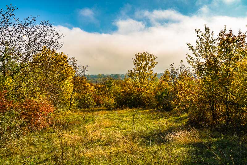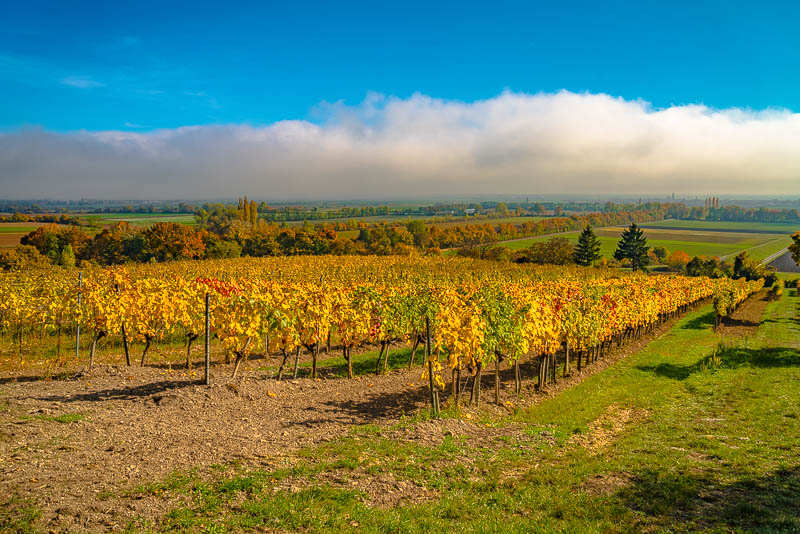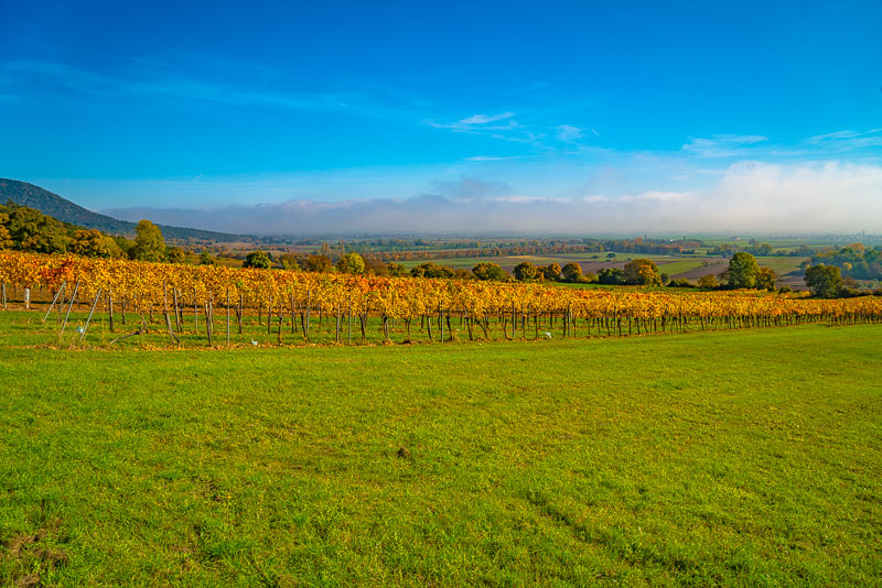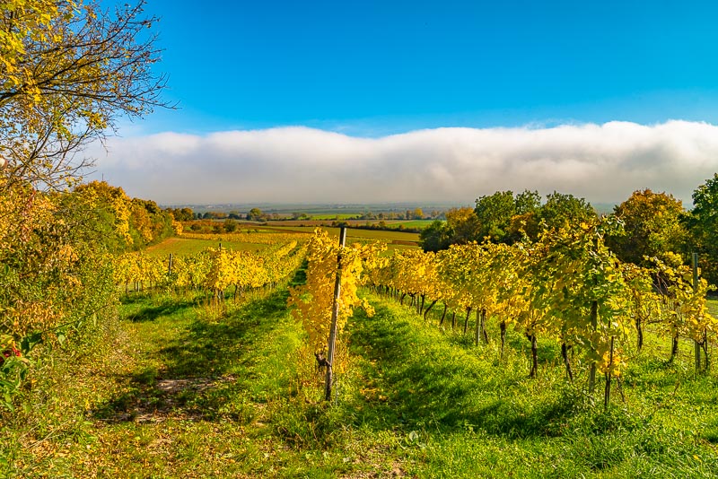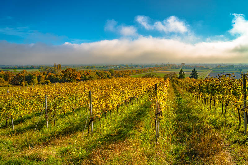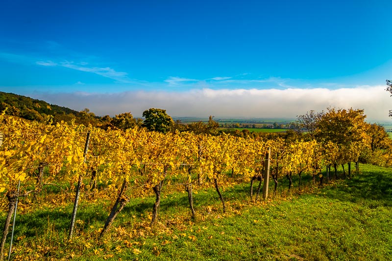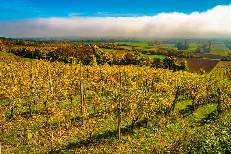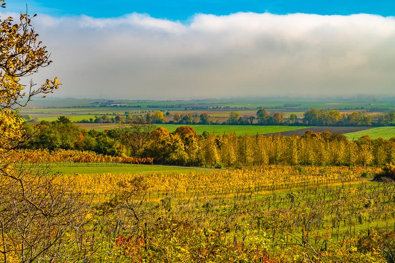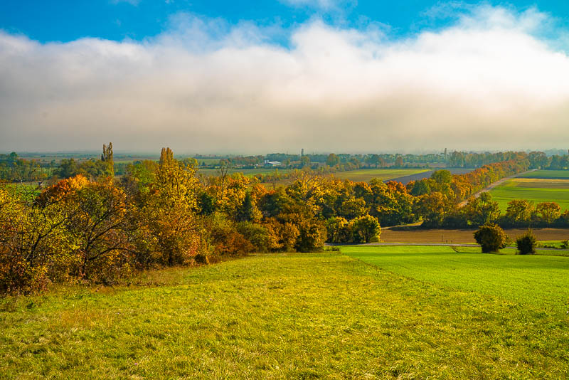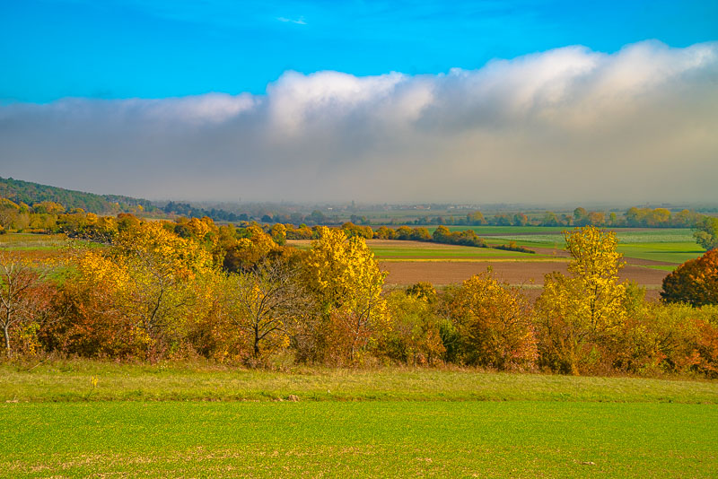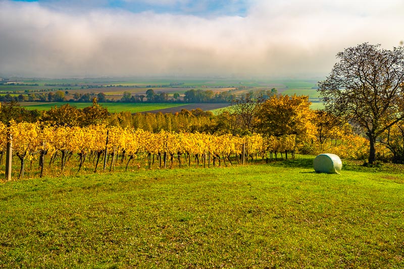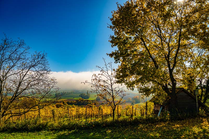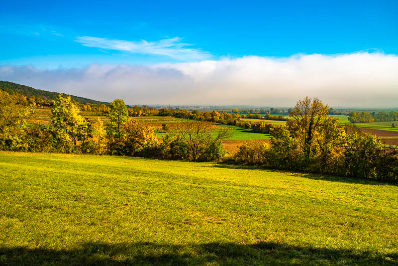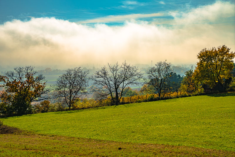 Richtung Winzendorf erscheint der Nebel im Gegenlicht noch malerischer.