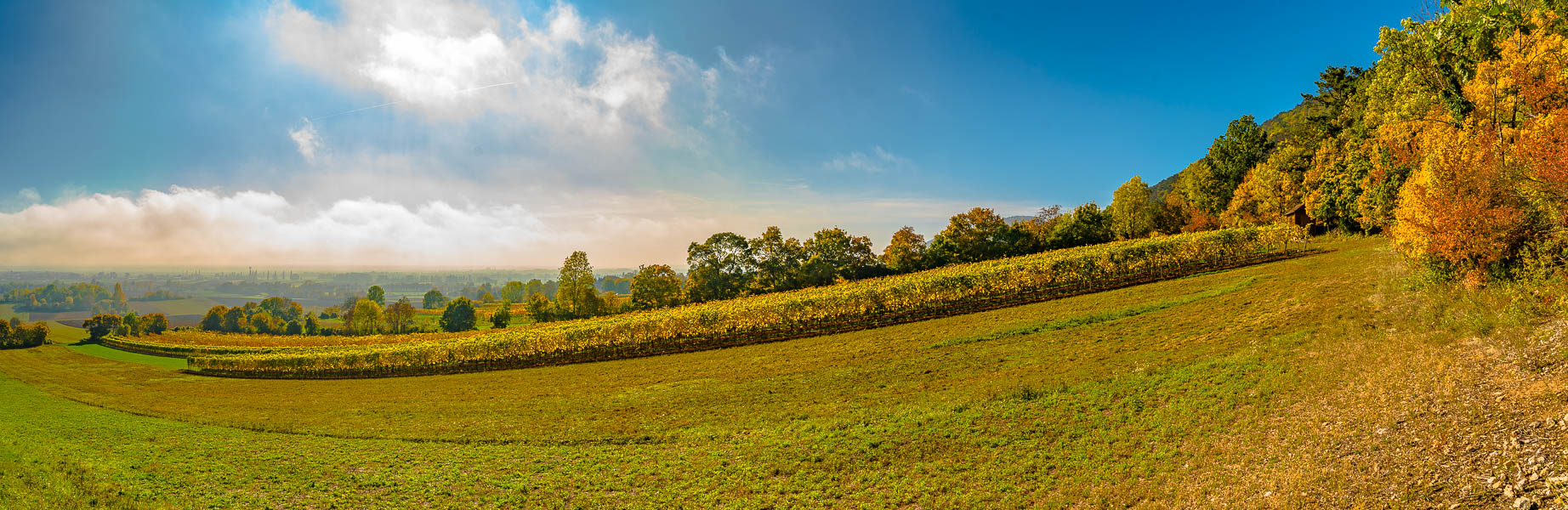 Weingartenpanorama, im Hintergrund Weikersdorf, halb im Nebel.