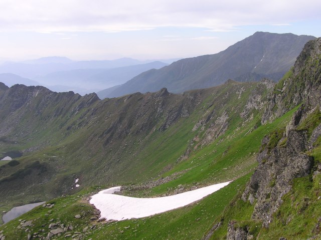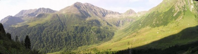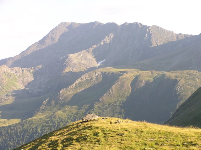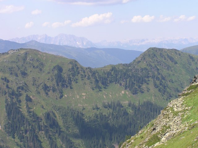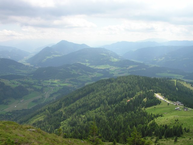 Blick Richtung Süden. Am linken Bildrand der Grünsee, rechts hinten der Greim. In der Mitte der Südgrat der Schoberspitze. Ganz hinten die Nockberge