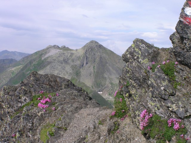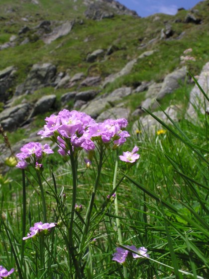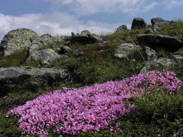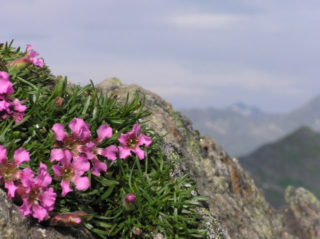 Auf dem Grat zur Schoberspitze in etwa 2.200 m Seehöhe blüht in exponierter Lage das niedere Seifenkraut (Saponaria pumila).