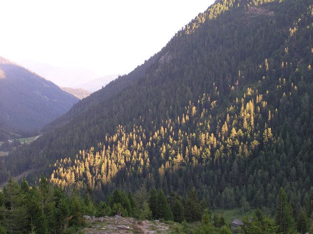 Letzte Sonnenstrahlen im Wald oberhalb der Neunkirchner Hütte. Todmüde kommen