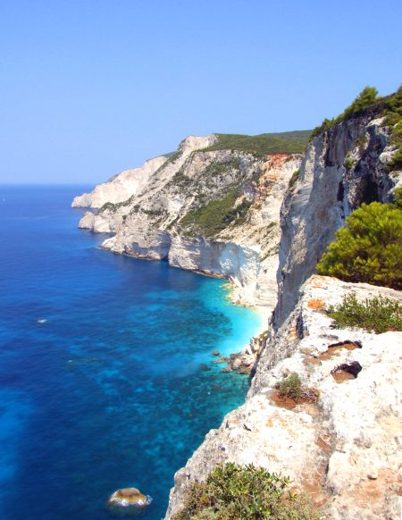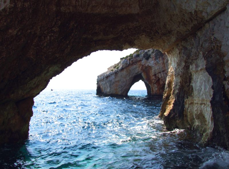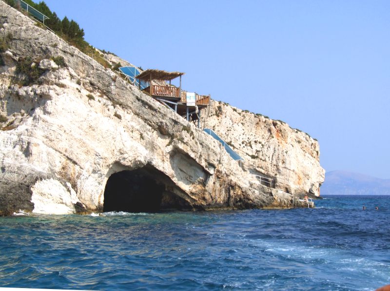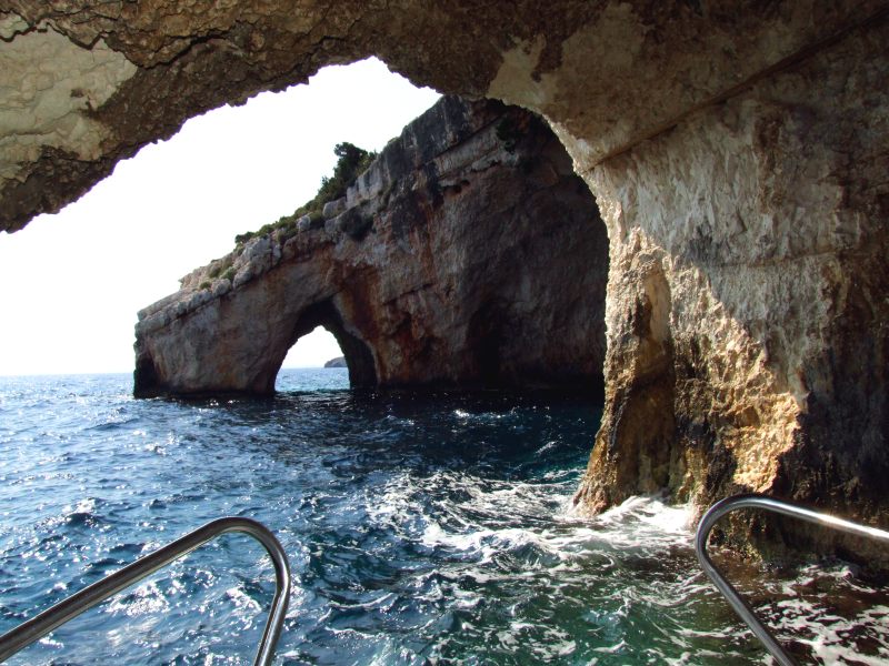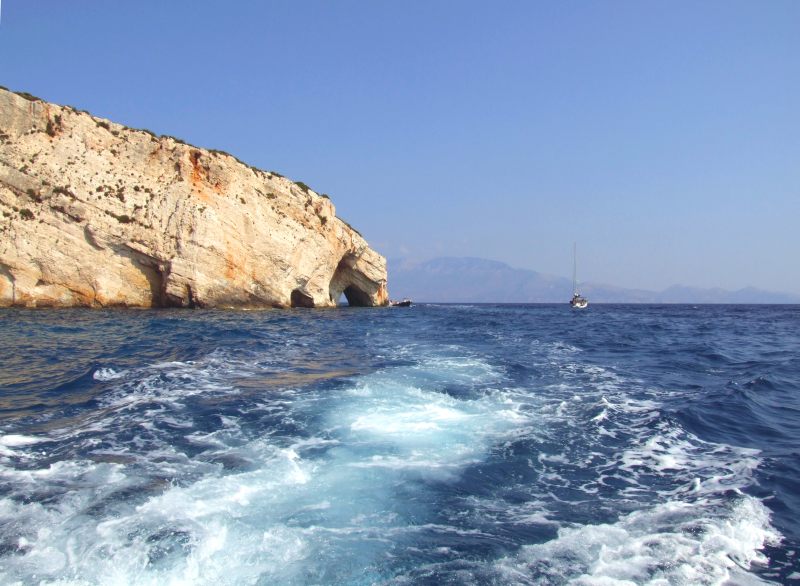 Hier hat man schon den Blick nach Kefallonia, der Nachbarinsel. Das Boot, das mich zu den Blauen Grotten bringen soll, kann gerade nicht anlegen und zieht Kreise.
