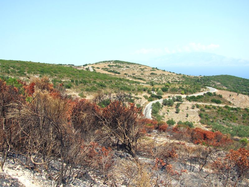 Ich fahre nun über die Insel weiter, nach Elies und Voulimes wieder nach Anafonitria. Unterwegs komme ich an Waldbrandstellen vorbei. Es heißt immer wieder, die Brände würden durch Brandstiftung entstehen, Grundstücksspekulanten stünden dahinter. Ich frage mich aber, was an diesen einsamen, trockenen Berghängen für die Spekulanten interessant ist?
