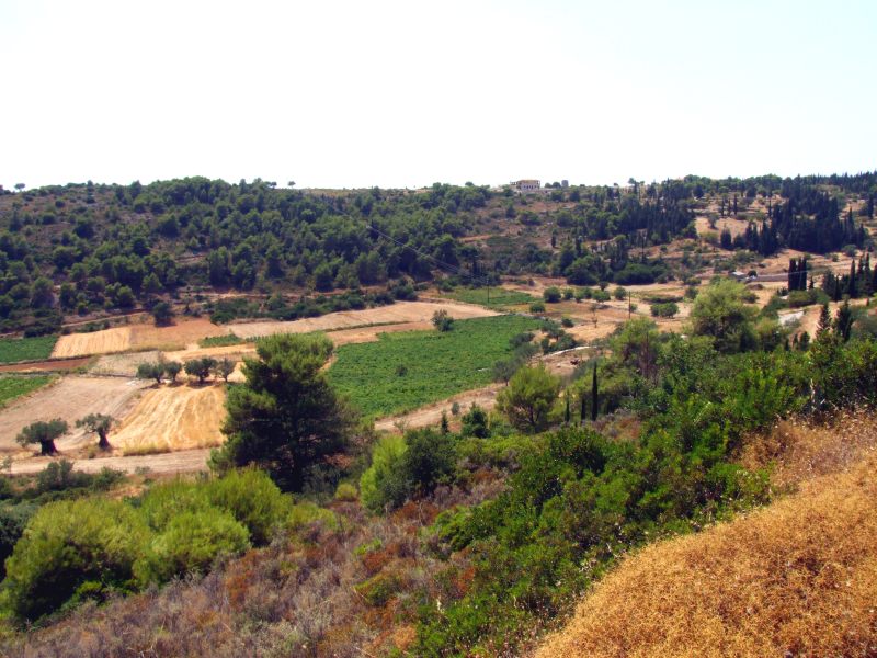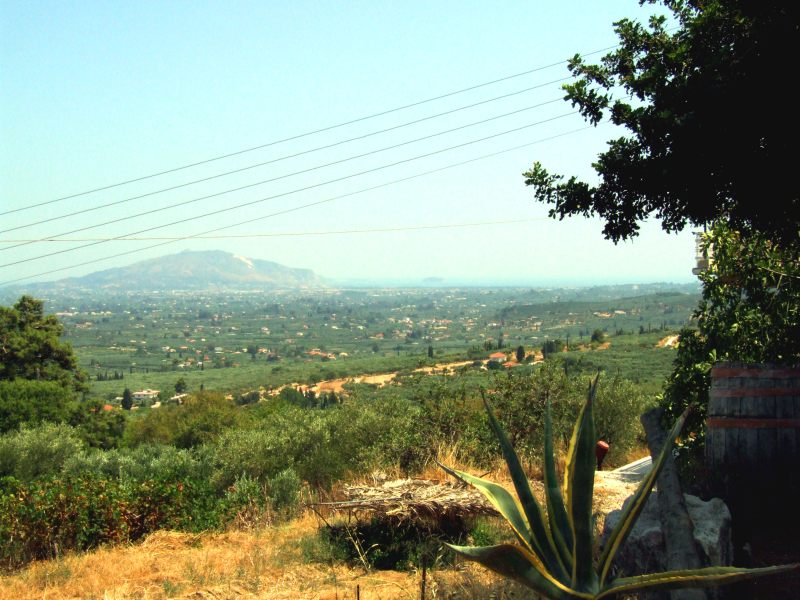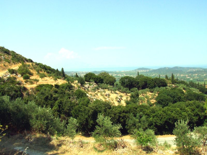 Die Straße führt zunächst durch ein enges Tal, an dessen Ausgang der Blick auf die große Ebene von Zakynthos frei wird. Blick Richtung Alikanas ...