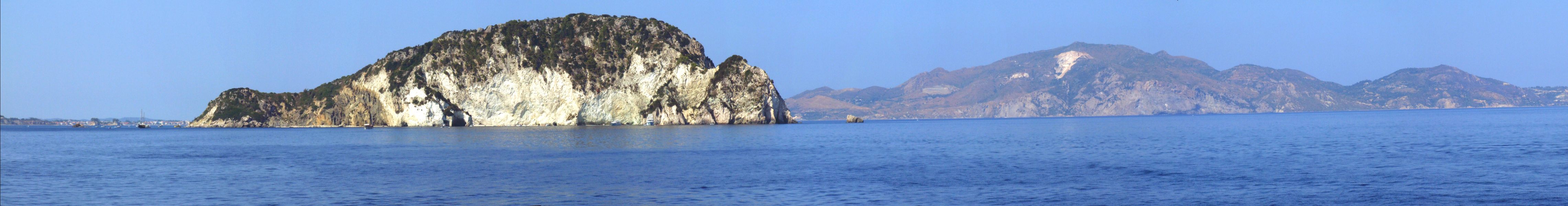 Panoramabild der Bucht von Laganas, mit der Insel Marathonisi im Vordergrund. Rechts hinten die Halbinsel Vasilikos.