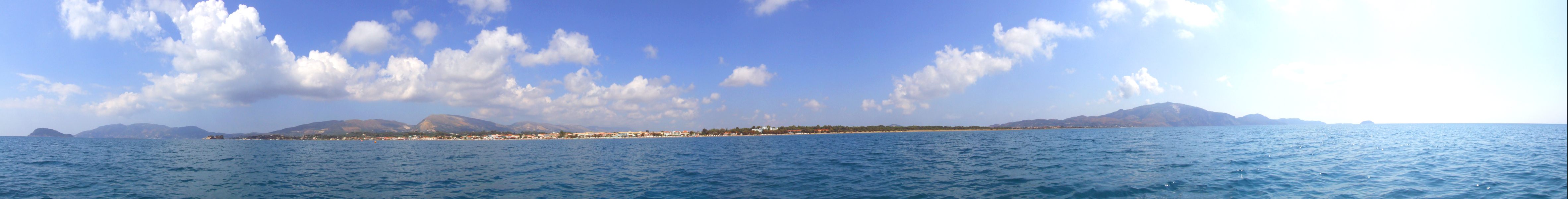 Panorama der Bucht von Laganas, vom Meer aus gesehen. Ganz links die Insel Marathonisi, dann die Halbinsel Keri, Laganas und die Berge, Malakia und die Halbinsel Vasilikos.