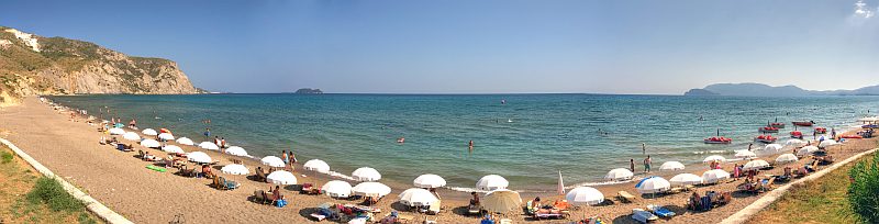 Panoramablick am Strand von Kalamaki. Hierher oder ins Bild klicken für eine größere Darstellung.