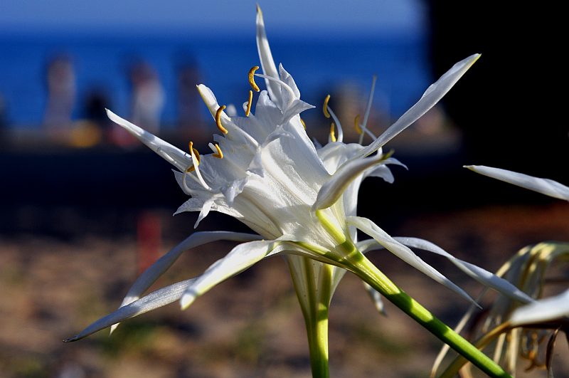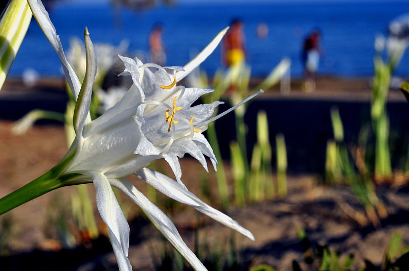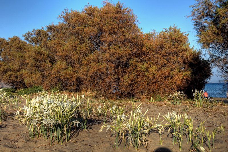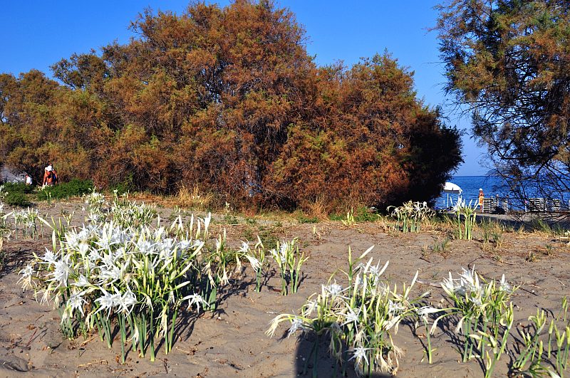 Zurück beim Hotel nütze ich das warme Licht des frühen Abends, um noch ein paar Bilder vom Hotelstrand zu machen. Vor allem die Unmengen an Großer Sternhyazinthe (Dünen-Trichternarzisse, Meeresstrandnarzisse, Mittelmeer-Pankrazlilie, Pancratium maritimum), die hier blühen.