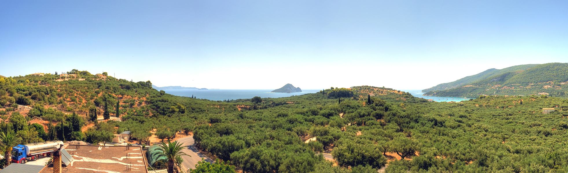 Die Straße führt an einer Taverne mit einer kleinen Windmühle vorbei. Von hier hat mein einen schönen Ausblick zur Bucht und Halbinsel von Keri.