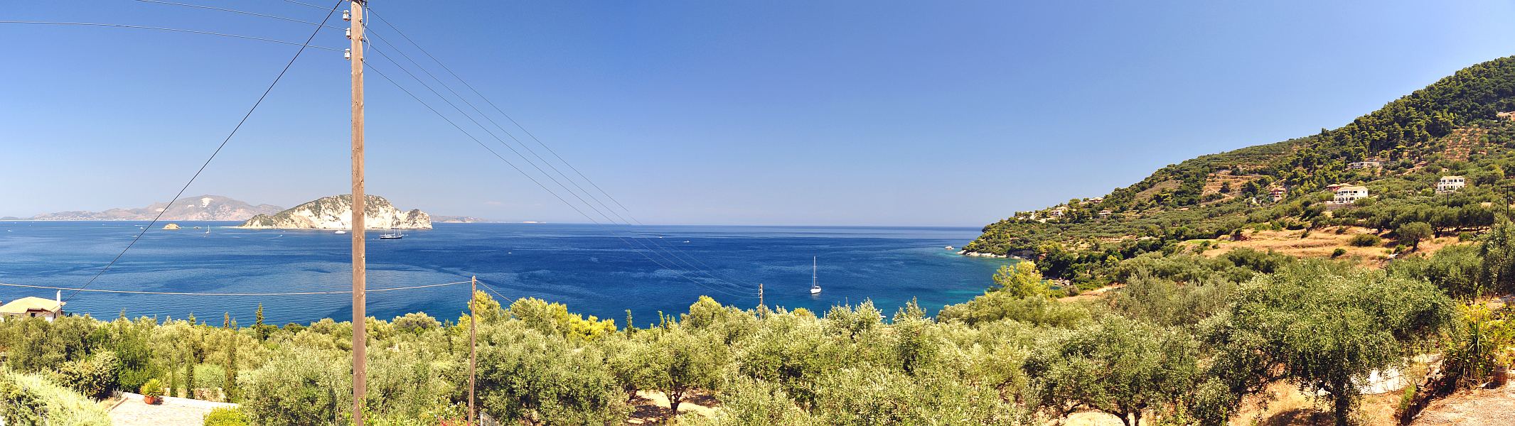 Blick von der Terrasse der Taverne in Marathia über die Bucht von Laganas und Marathonissi.