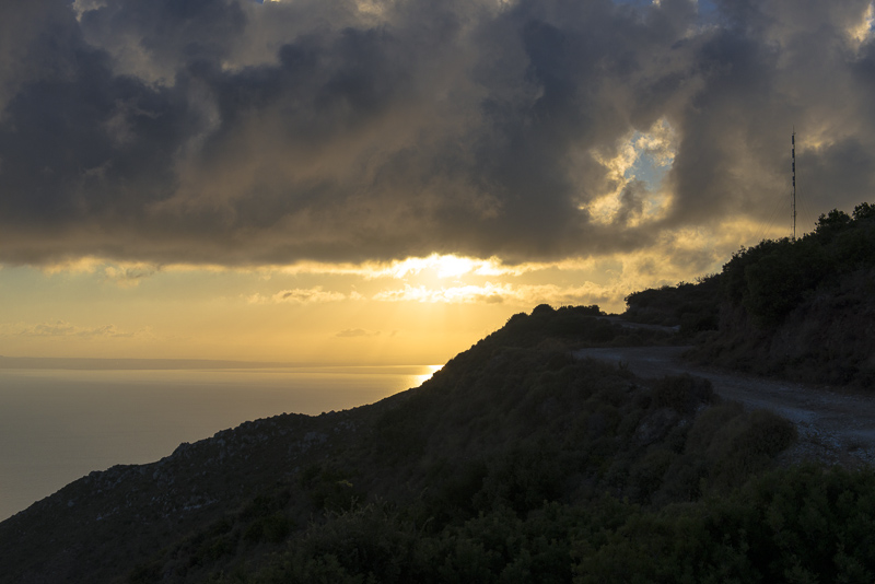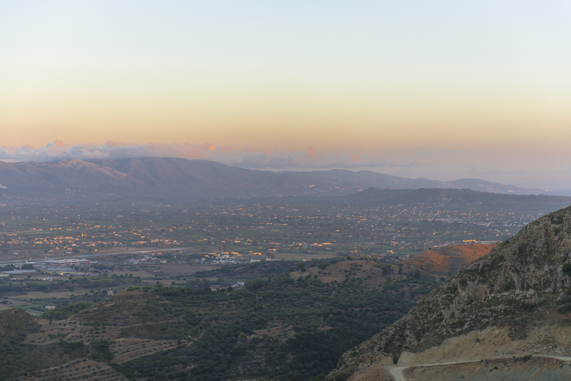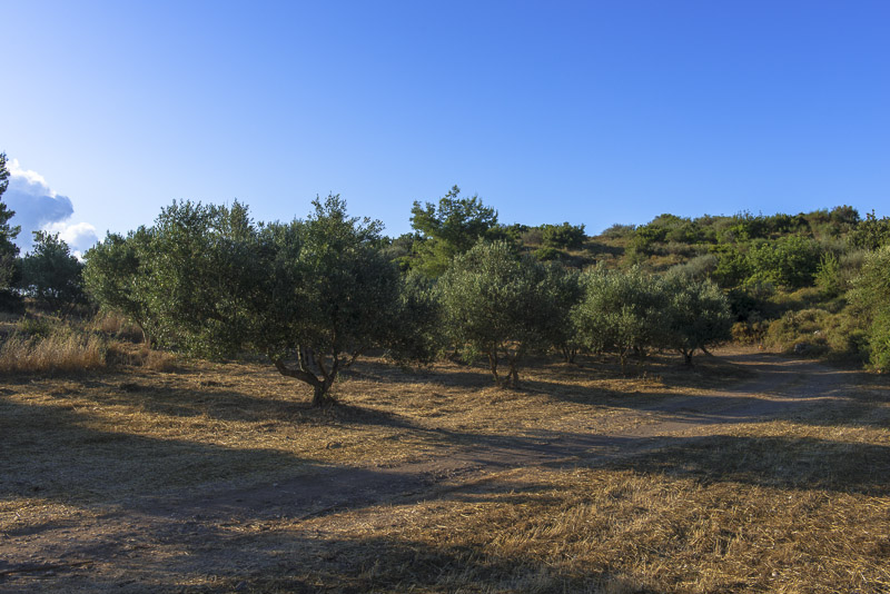 Schon 2012 wollte ich mal auf den Berg Skopos gehen; aber da hatte es zu Mittag 42 Grad, und dann waren auch die Nächte zu heiß. Heuer ist es verhältnismäßig kühl, man kann bei offener Tür ohne Klimaanlage herrlich schlafen. So stelle ich mir den Wecker auf 5:20, um 5:48 bin ich bereits unterwegs, zu einer Zeit, wo es nur wenig dämmerig ist, und die letzten Fledermäuse noch unterwegs sind.