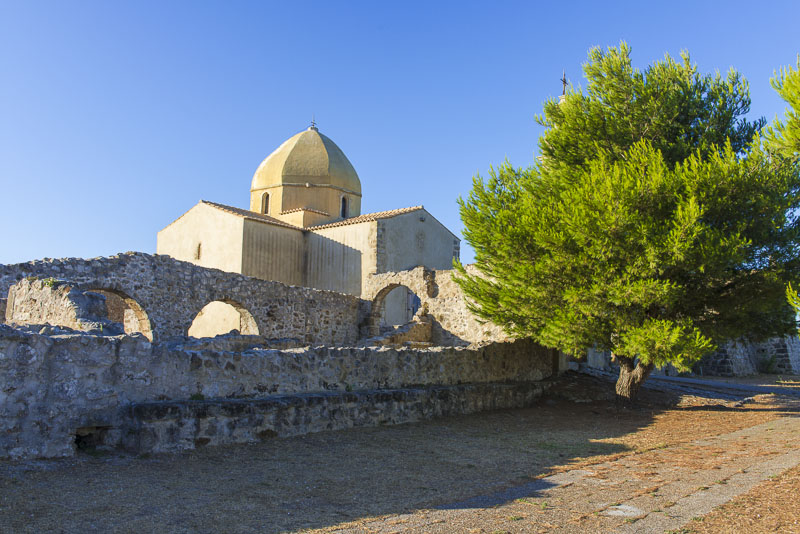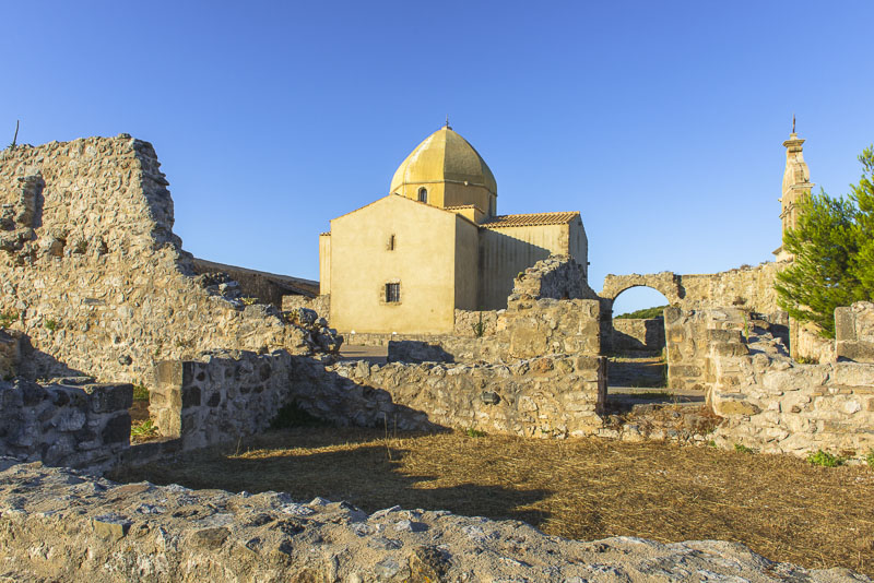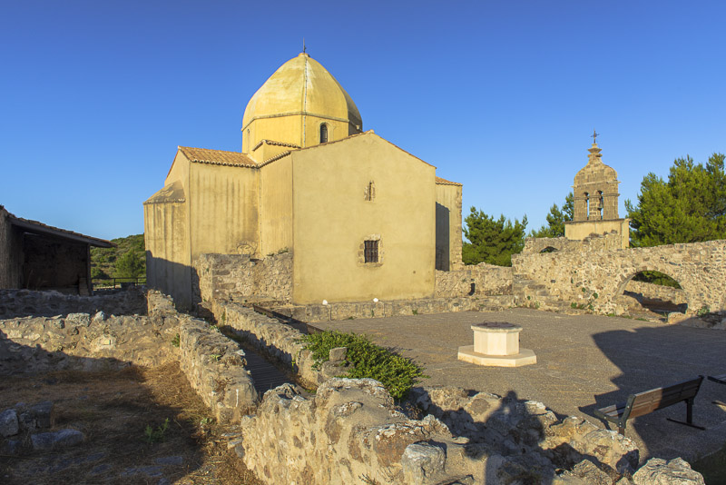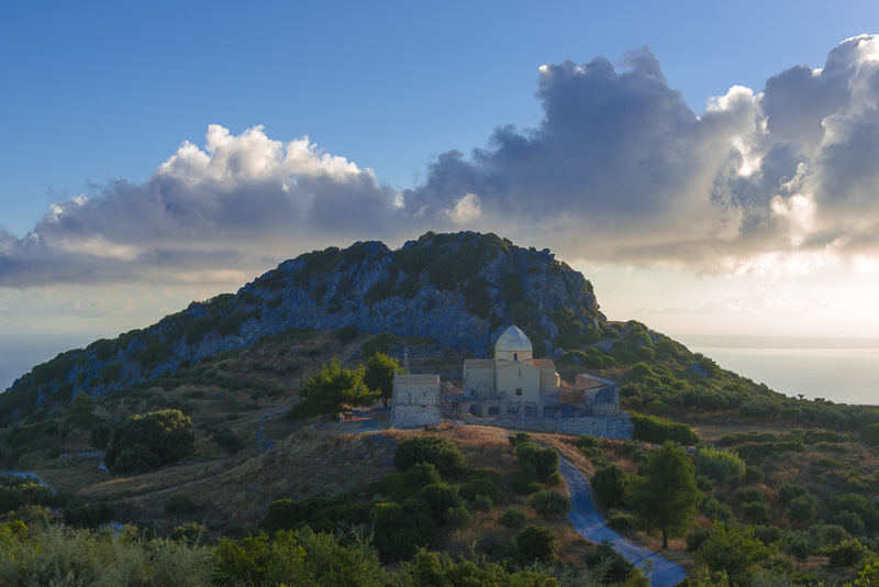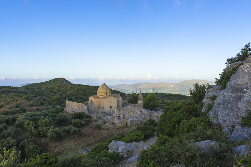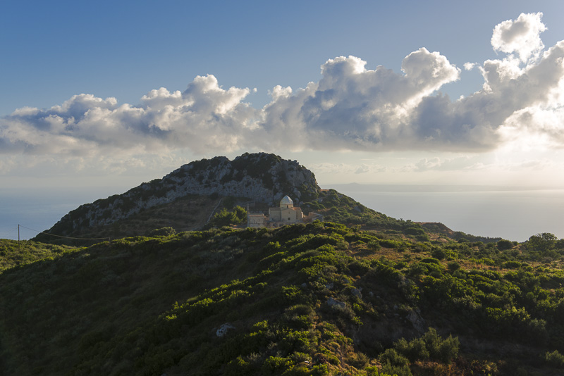 Am Gipfel ist, auf einem kleinen Plateau, eine Kirche und ein verfallenes Kloster. Den Durchstieg durch die Felsen zum eigentlichen höchsten Punkt finde ich nicht, deswegen gehe ich ...