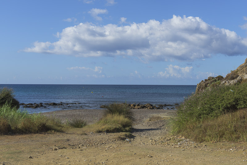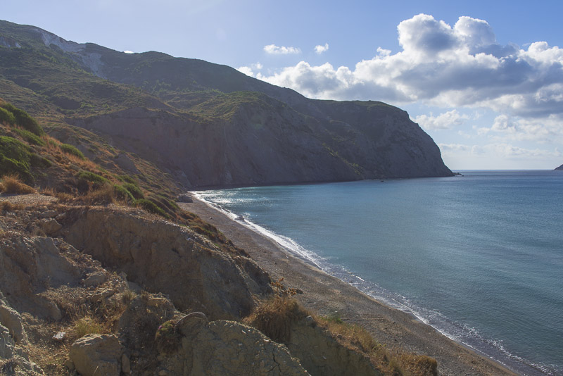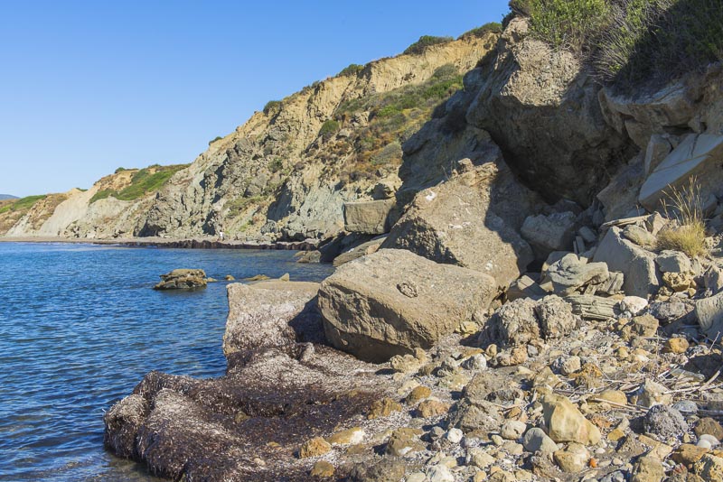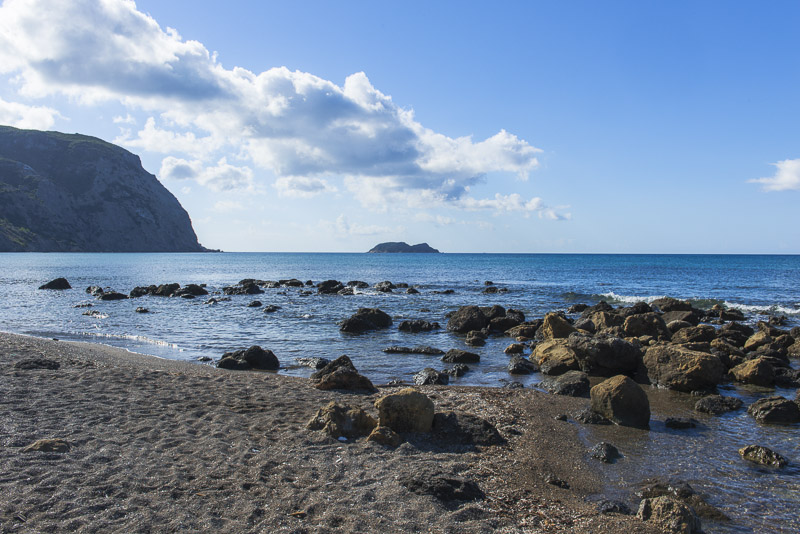 Wo der Strand hier zu Ende ist, fließt aus einem überhängenden Felsen eine Quelle direkt ins Meer.