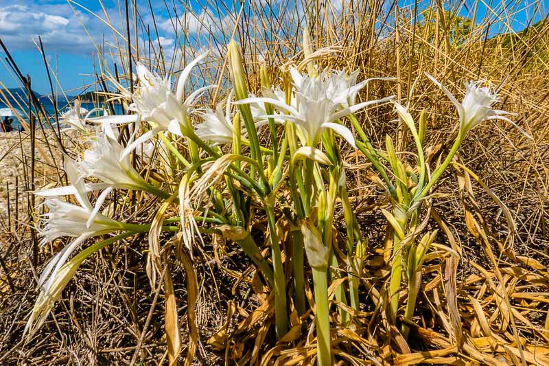 Am Rand blühen weiße Strandlilien (Dünen - Trichternarzissen, Pancratium maritimum).