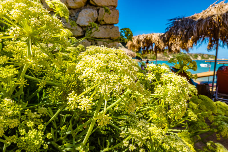 Aus den Ritzen der Steinmauer wächst Meerfechel (Crithmum maritimum).