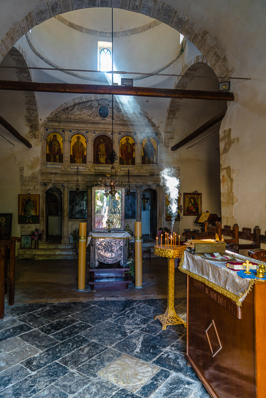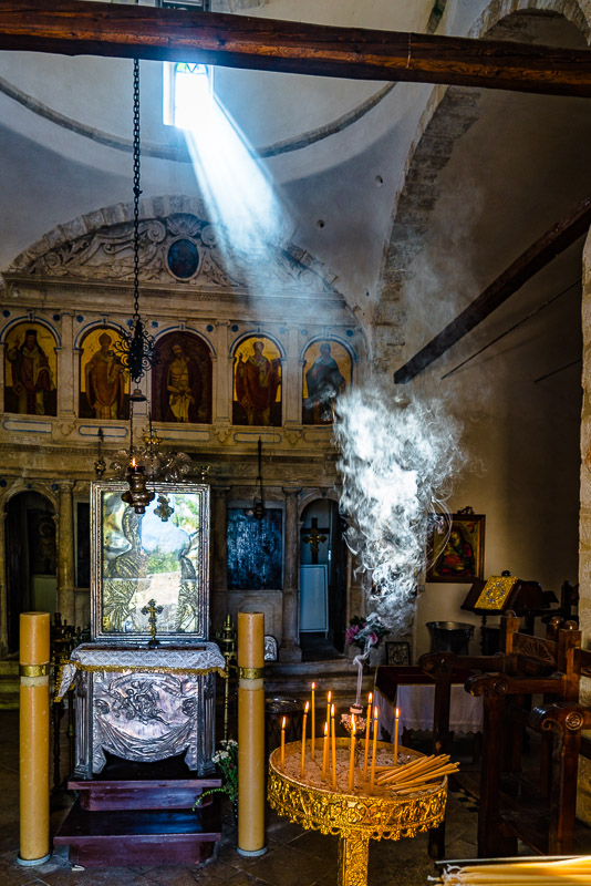 Die Kirche ist offen, Kerzen und Räucherstäbchen geben einen wunderbaren Effekt im Lichtstrahl, der durch ein hohes Fenster fällt.