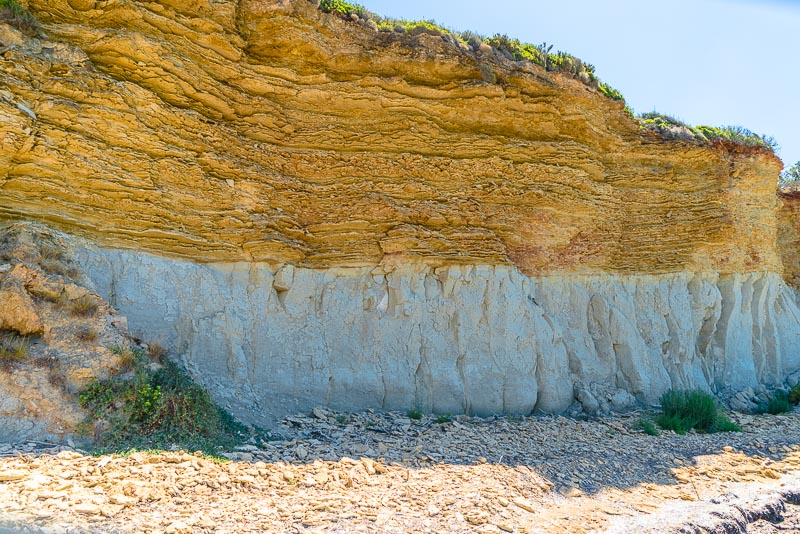 Am südlichen Ende des Strandes stehen imposante Felsen in inteessanter Schichtung - geschichteter Sandstein über weißem Mergel (Lehm). Letzterer ist sehr weich und brüchig, weswegen Bergsturzgefahr droht und das Gebiet abgesperrt ist.