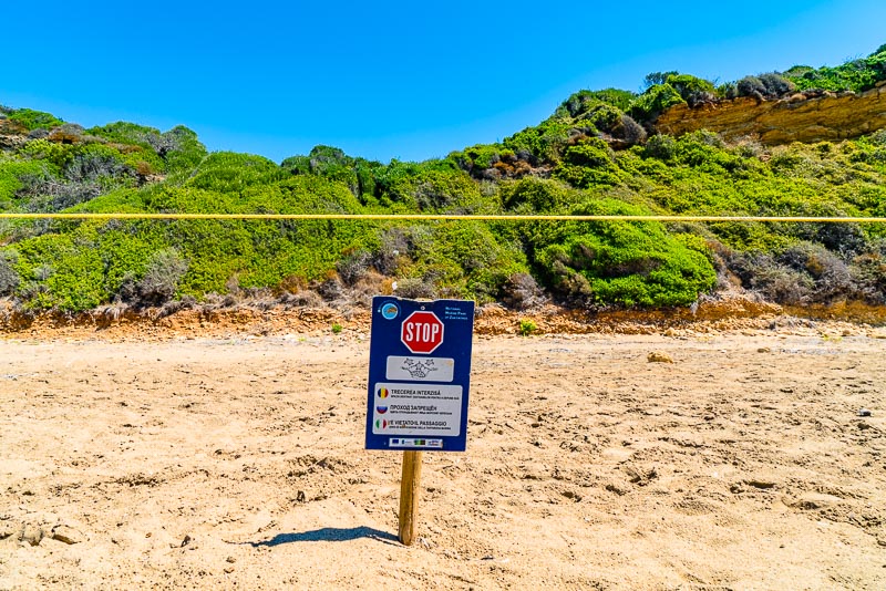 Die große Bucht des Strandes von Gerakas. Menschen dürfen sich nur auf einem schmalen Streifen am Strand aufhalten - dahinter ist die Zone der Nester, die nicht betreten werden darf.