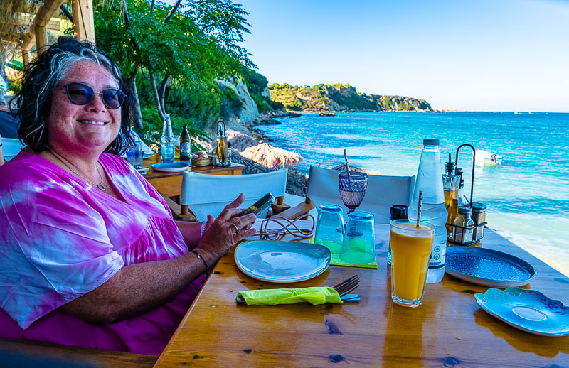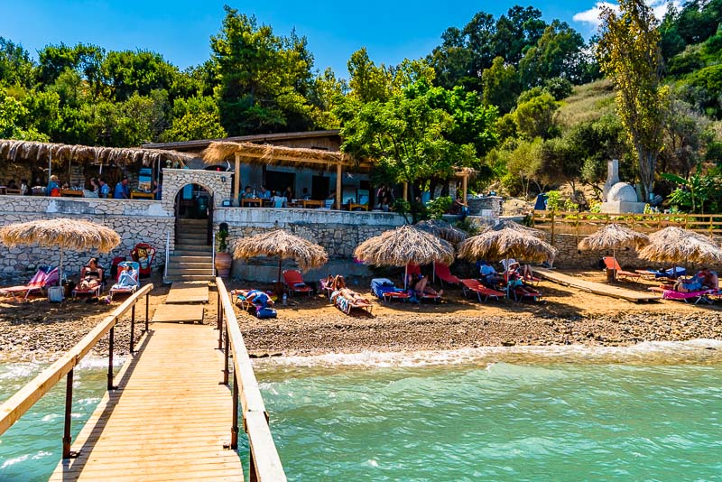 Wir fahren weiter, etwa 2 km zum Strand von Porto Roma. Hier wissen wir aus früheren Aufenthalten von einer ganz wunderbar schön gelegenen Taverne - Nikos´ Taverne. Aus Deckenstützen und Brettern wurde hier ein ganz einfacher Steg gebaut, um den steinigen Weg ins Meer zu erleichtern.