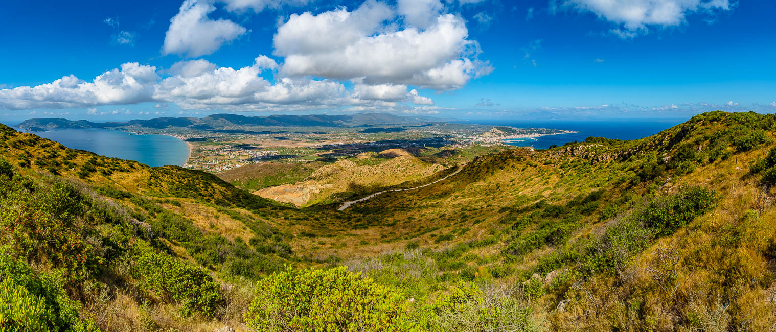 Panoramablick vom Berg Skopos nach Norden: zur Bucht von Laganas, zu den Bergen der Westküste, wo wir gestern waren, zur Nordpitze der Insel und vorne zur Hauptstadt Zakynthos. Rechts hinten in der Ferne die Nachbarinsel Kefallonia.