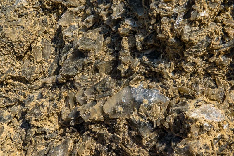 Manche Felsen am Strand sind übersät von Gipskristallen, die teilweise in Bändern das Gestein durchziehen, ...