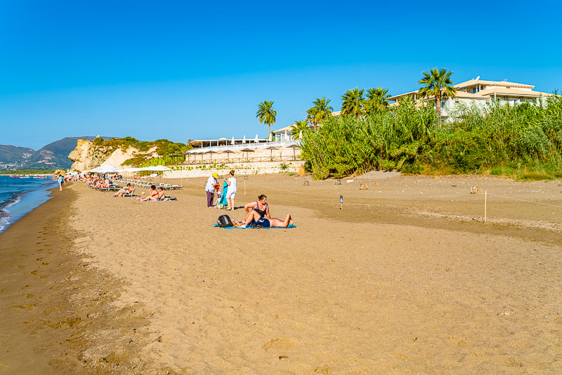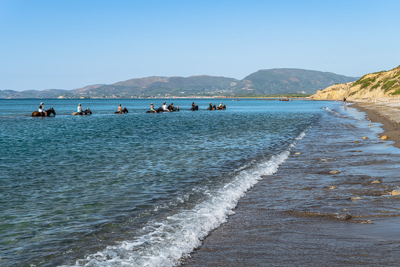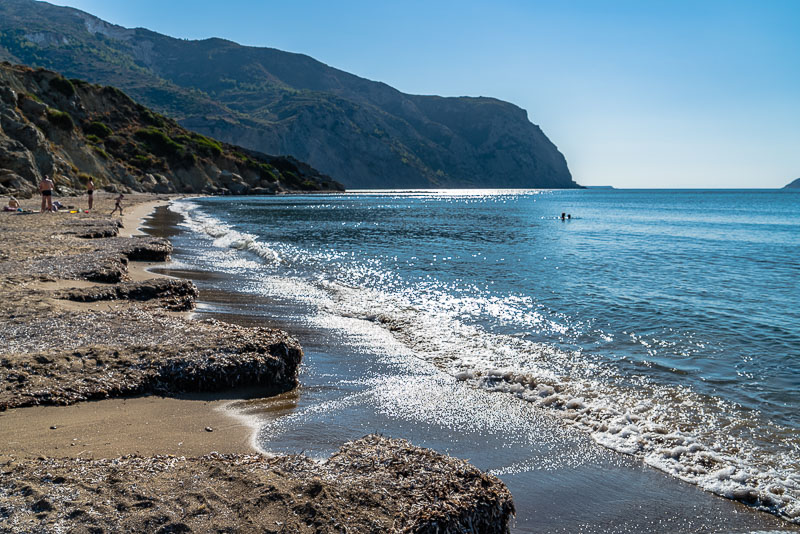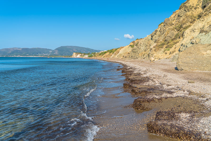 Es geht zunächst den Sandstrand entlang. Blick Richtung Süden die Halbinsel Vasilikos entlang.