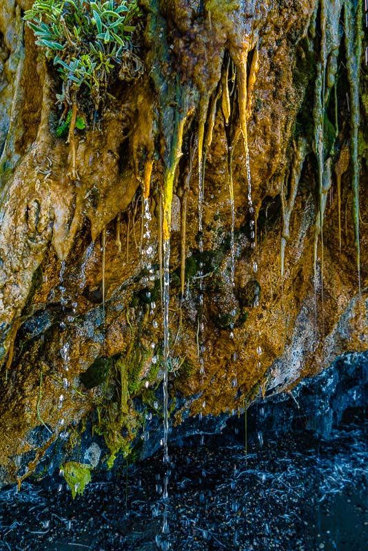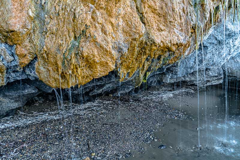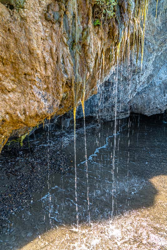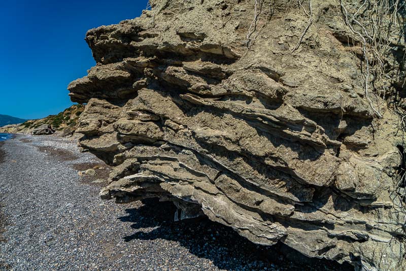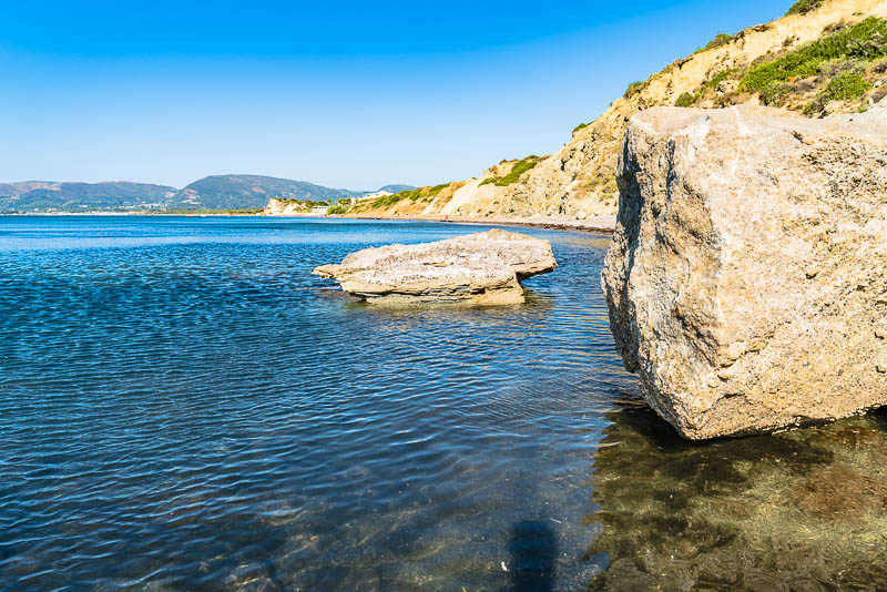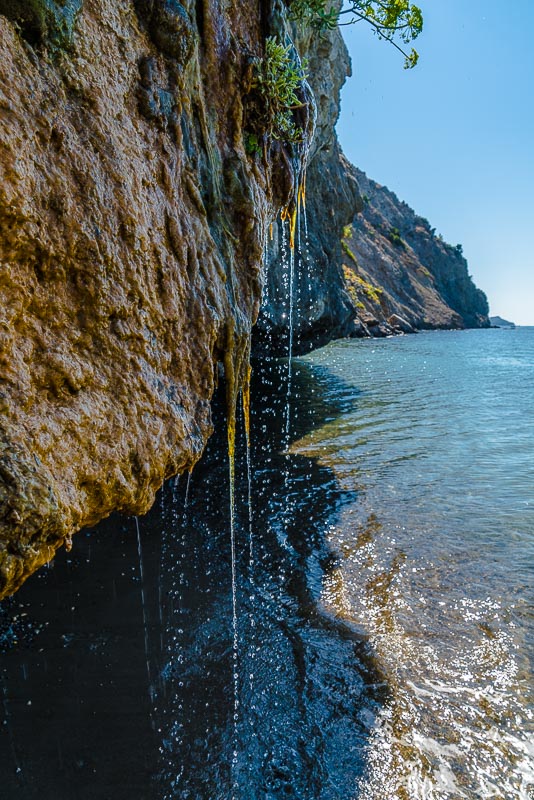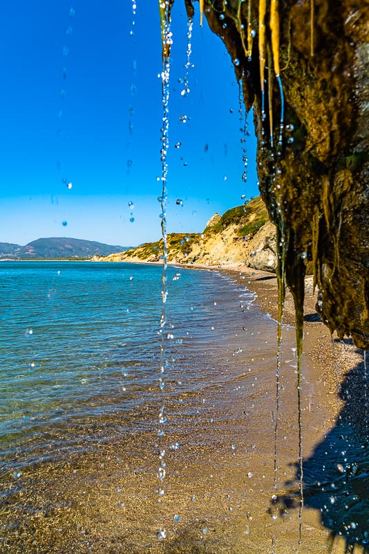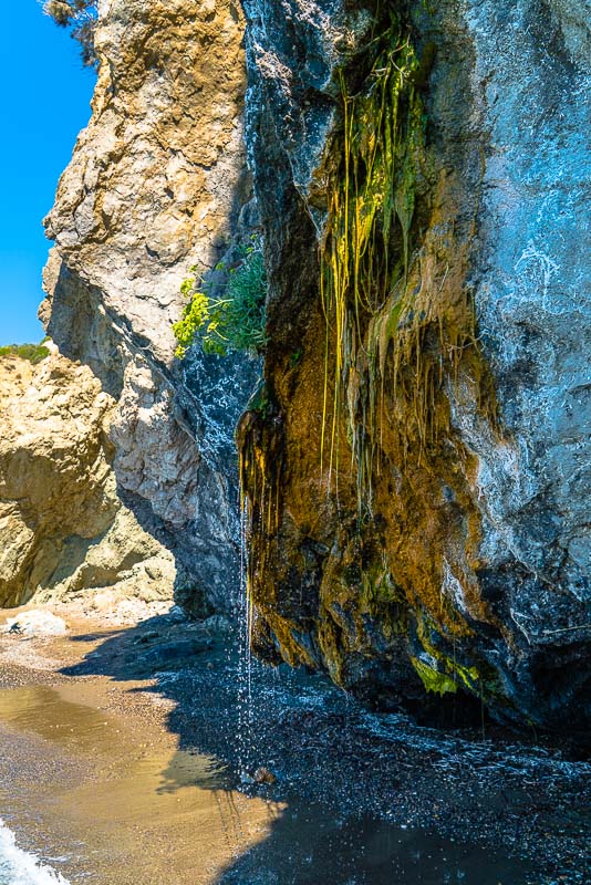 Am Ende des Strandes beginnen die Felsen der Halbinsel Vasilikos. Hier rinnt über einen abgebrochenen, unten von der Brandung ausgehöhlten Felsen eine Wasserquelle, wo knapp oberhalb aus einem Felsspalt Wasser austritt.