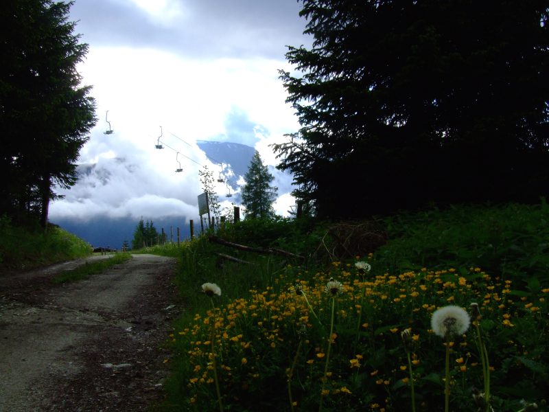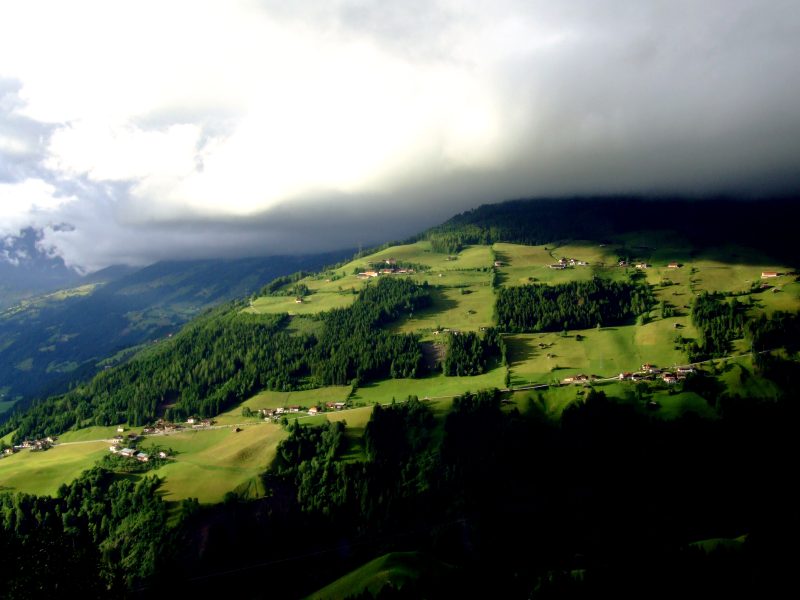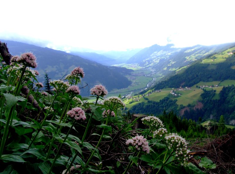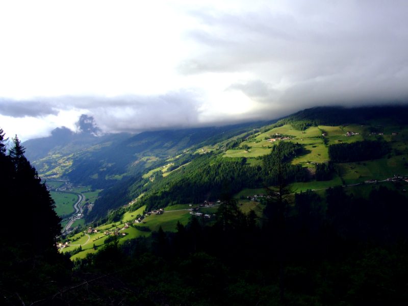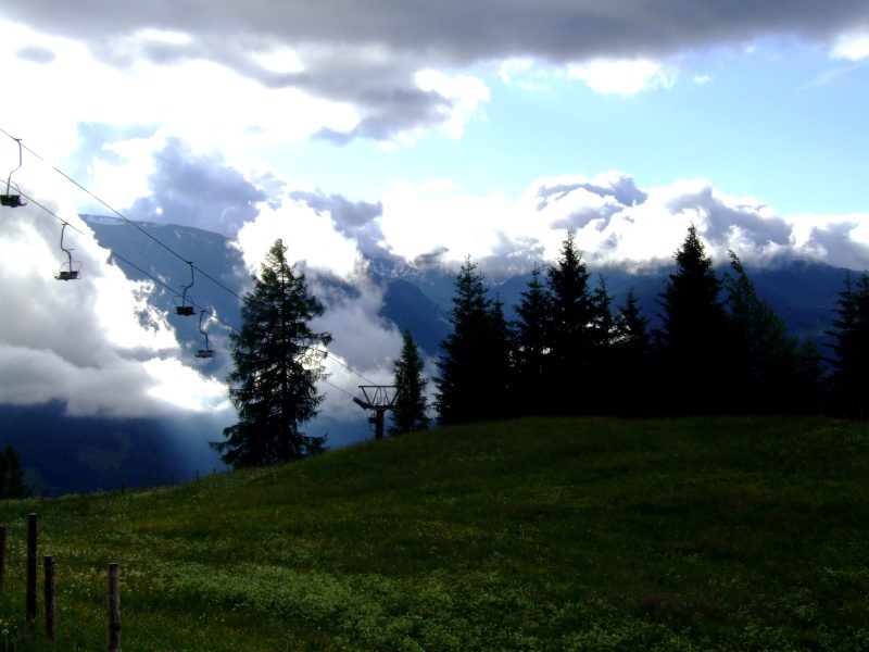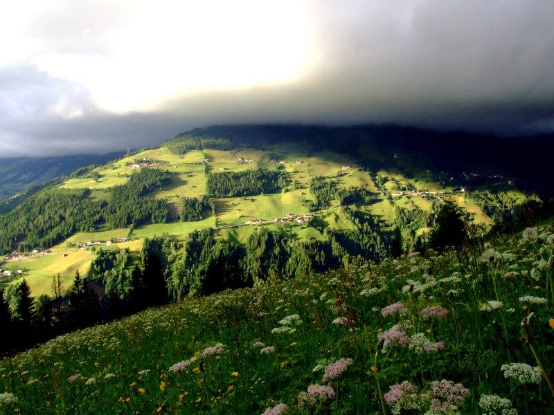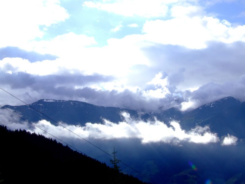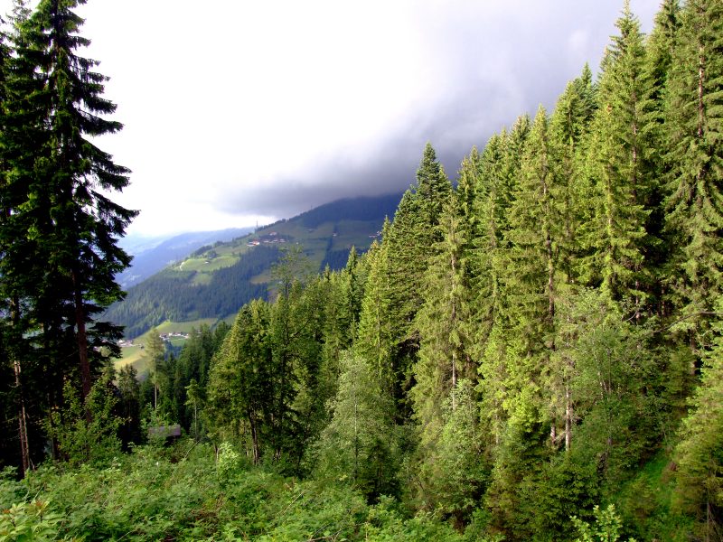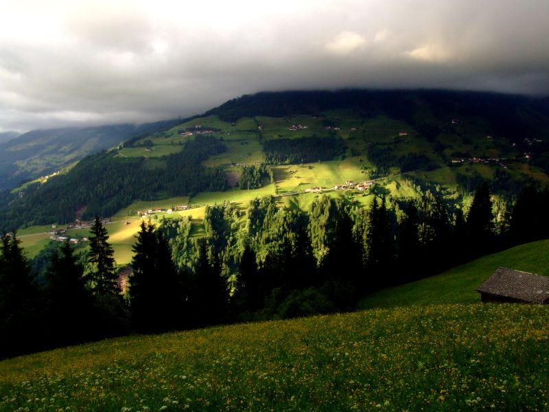 After a whole day on the microscope attending a course at the dermotological ward of the university hospital of Innsbruck I drive back in the evening to my accomodation in Hainzenberg in the Ziller dale. Daylight lasting for long at this season and not raining just now, I decide to do a little evening walk. Clouds are hanging deep which usually means bad weather, but in some spaces there are sunny spells. I climb up in a direct way from Hainzenberg (960 m) through the forest up to mountain pasture land at Sonnalm (1.360 m).