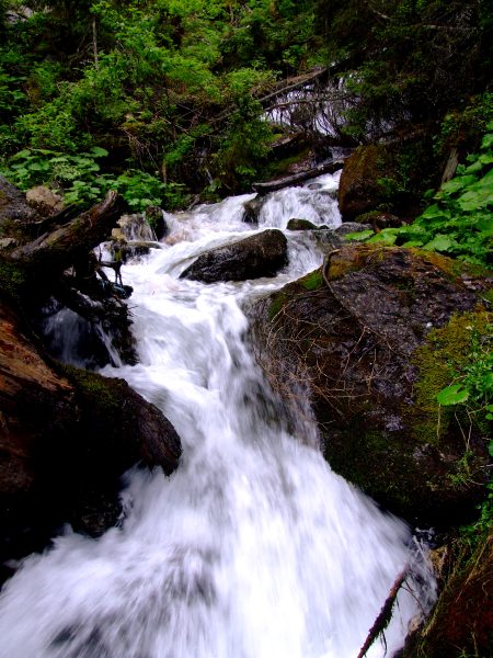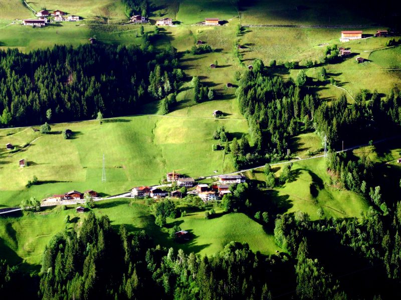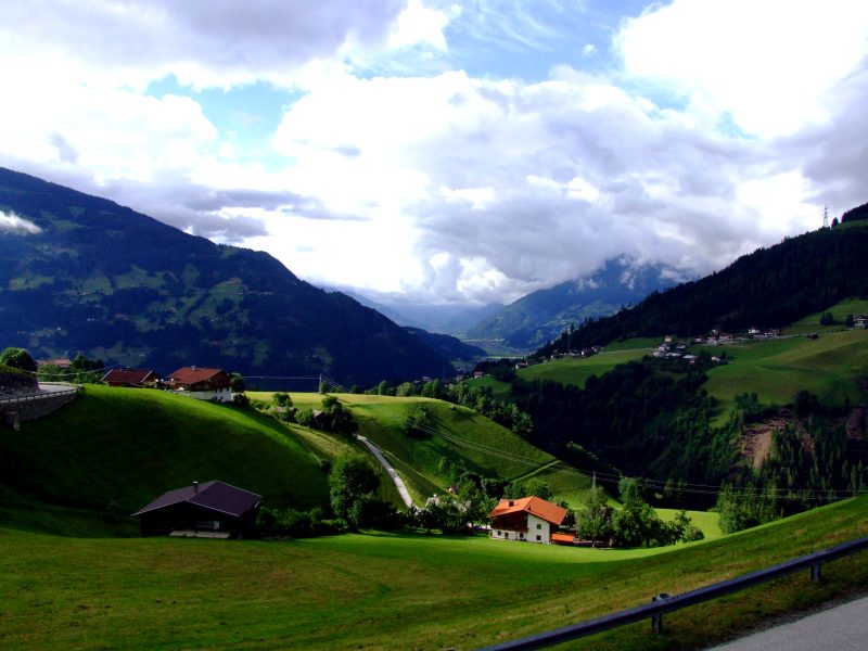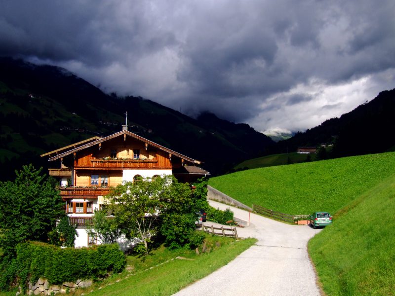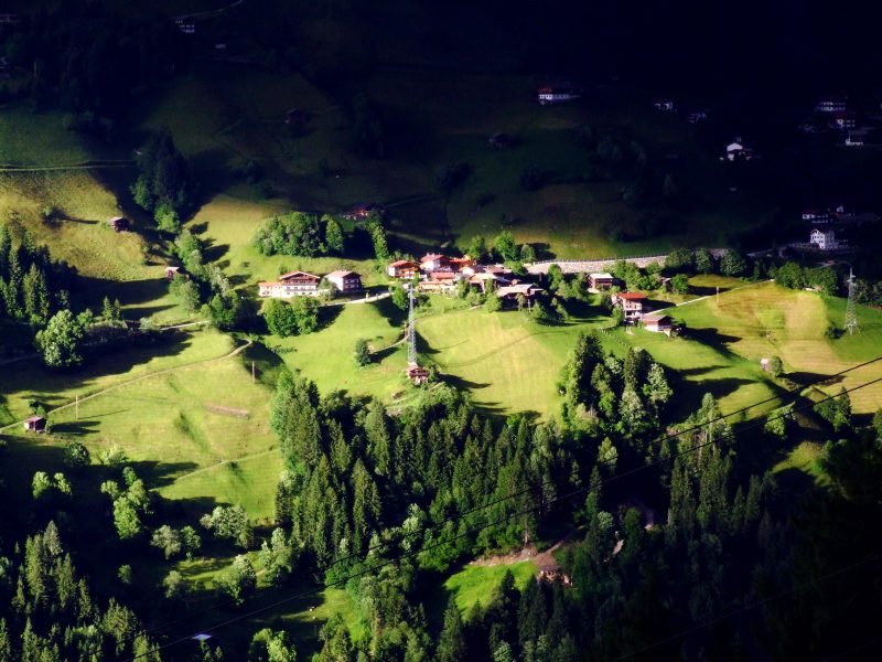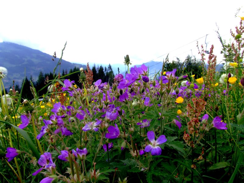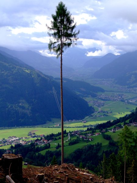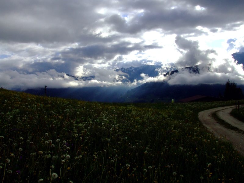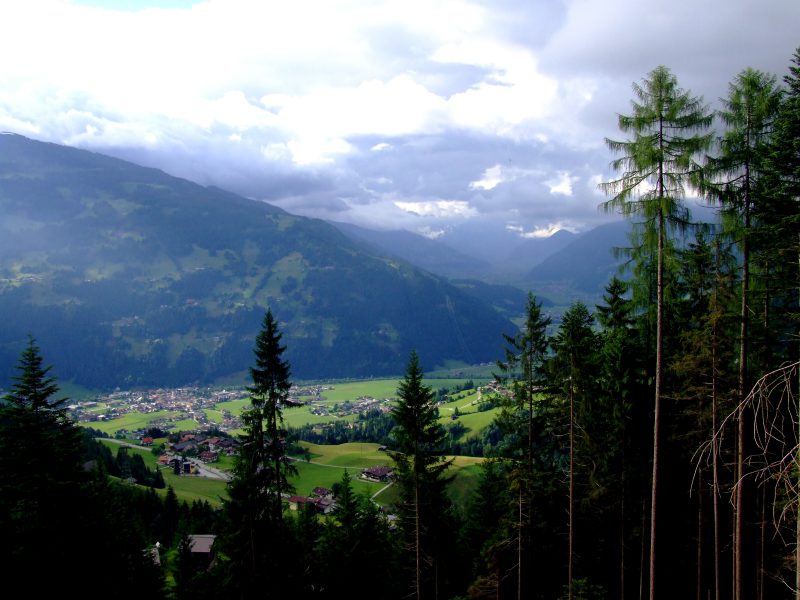 After a whole day on the microscope attending a course at the dermotological ward of the university hospital of Innsbruck I drive back in the evening to my accomodation in Hainzenberg in the Ziller dale. Daylight lasting for long at this season and not raining just now, I decide to do a little evening walk. Clouds are hanging deep which usually means bad weather, but in some spaces there are sunny spells. I climb up in a direct way from Hainzenberg (960 m) through the forest up to mountain pasture land at Sonnalm (1.360 m).