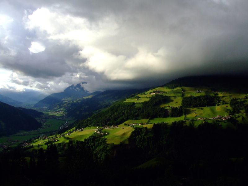 On the descent, the mountain opposite the Gerlos valley is highlighted by a sunny spell.