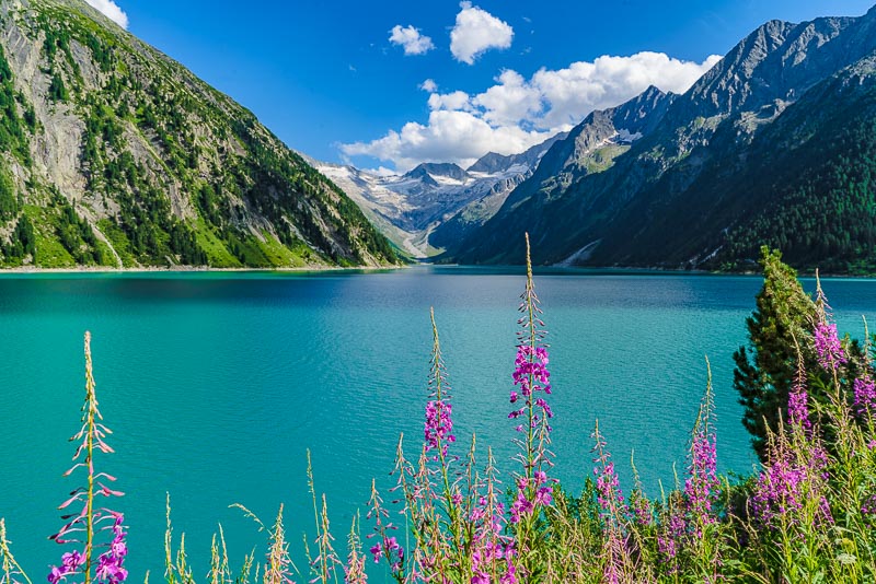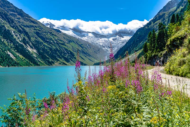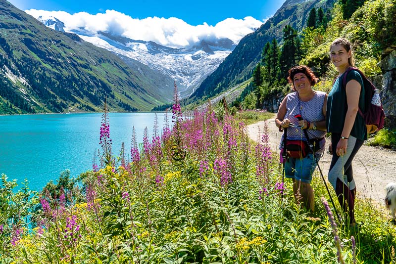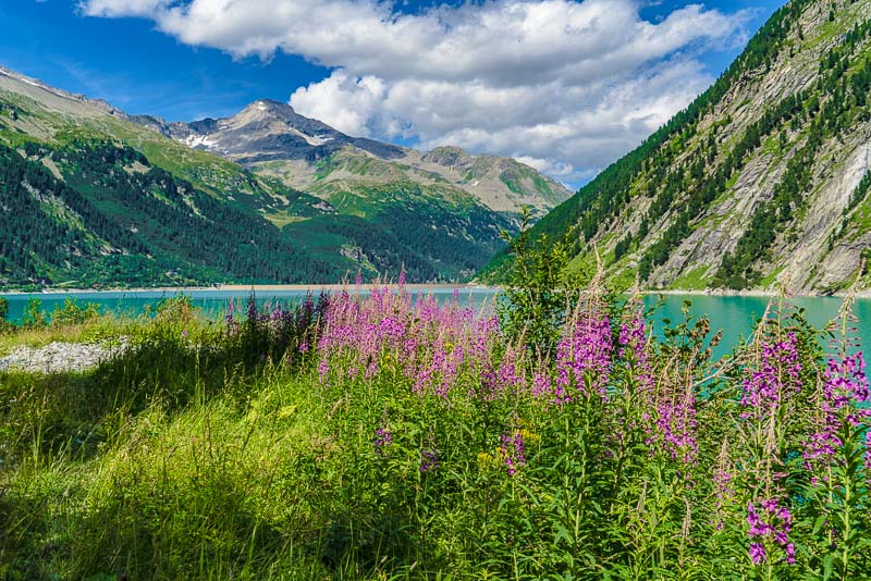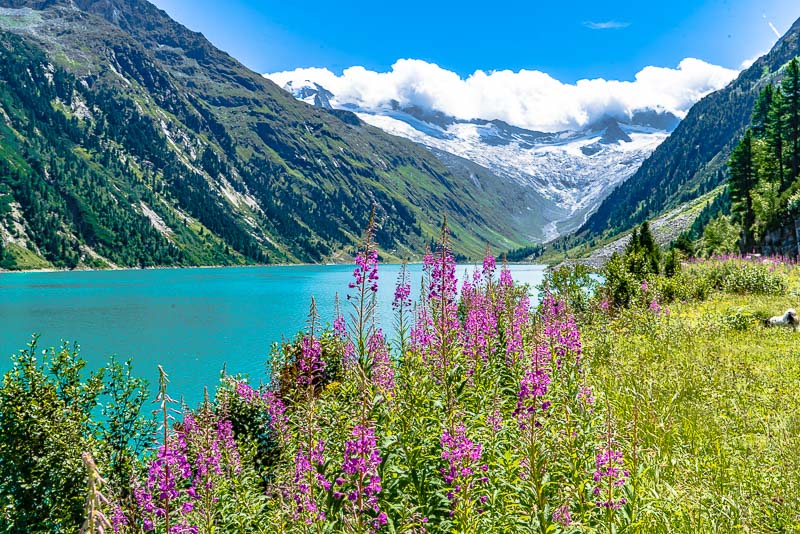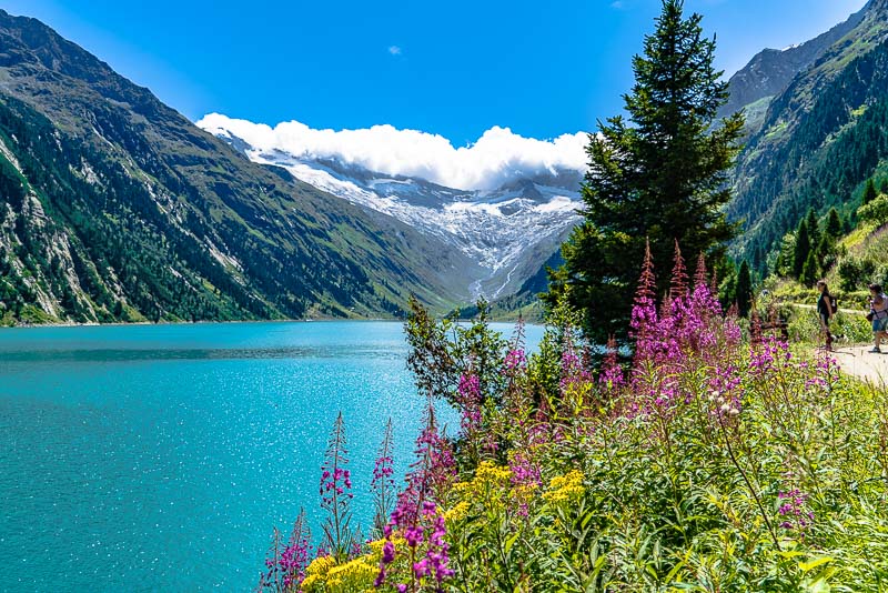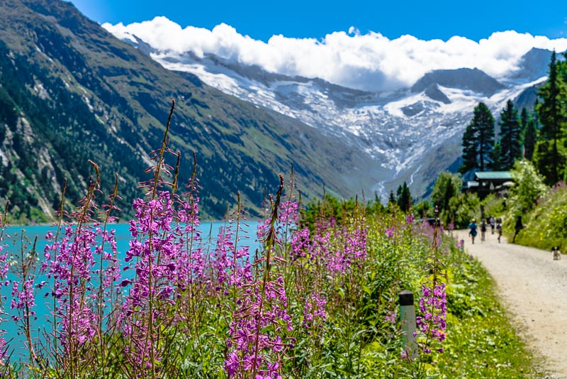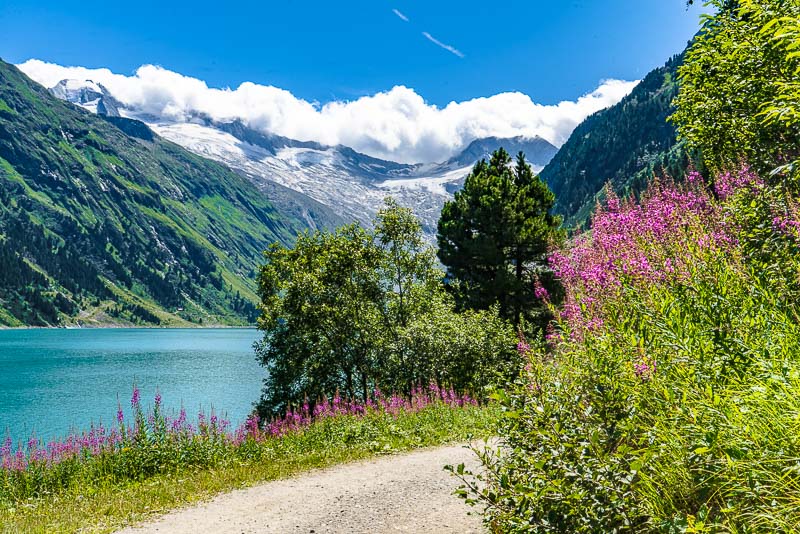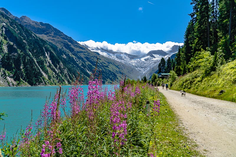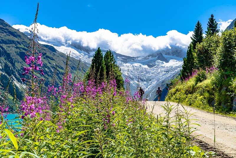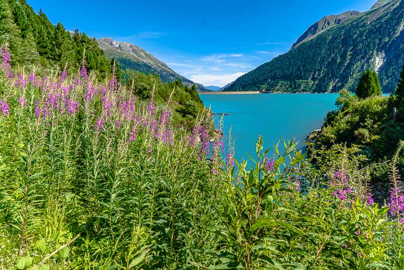 We drive up to the Schlegeis reservoir, far behind at the head of the Zillertal, above the small village of Ginzling. Jam between Zell am Ziller and Mayerhofen, another 20 minutes are spent before the contraflow traffic light near the tollgate. But the day is beautiful and long, and we only want to walk along the reservoir, so we don´t mind.